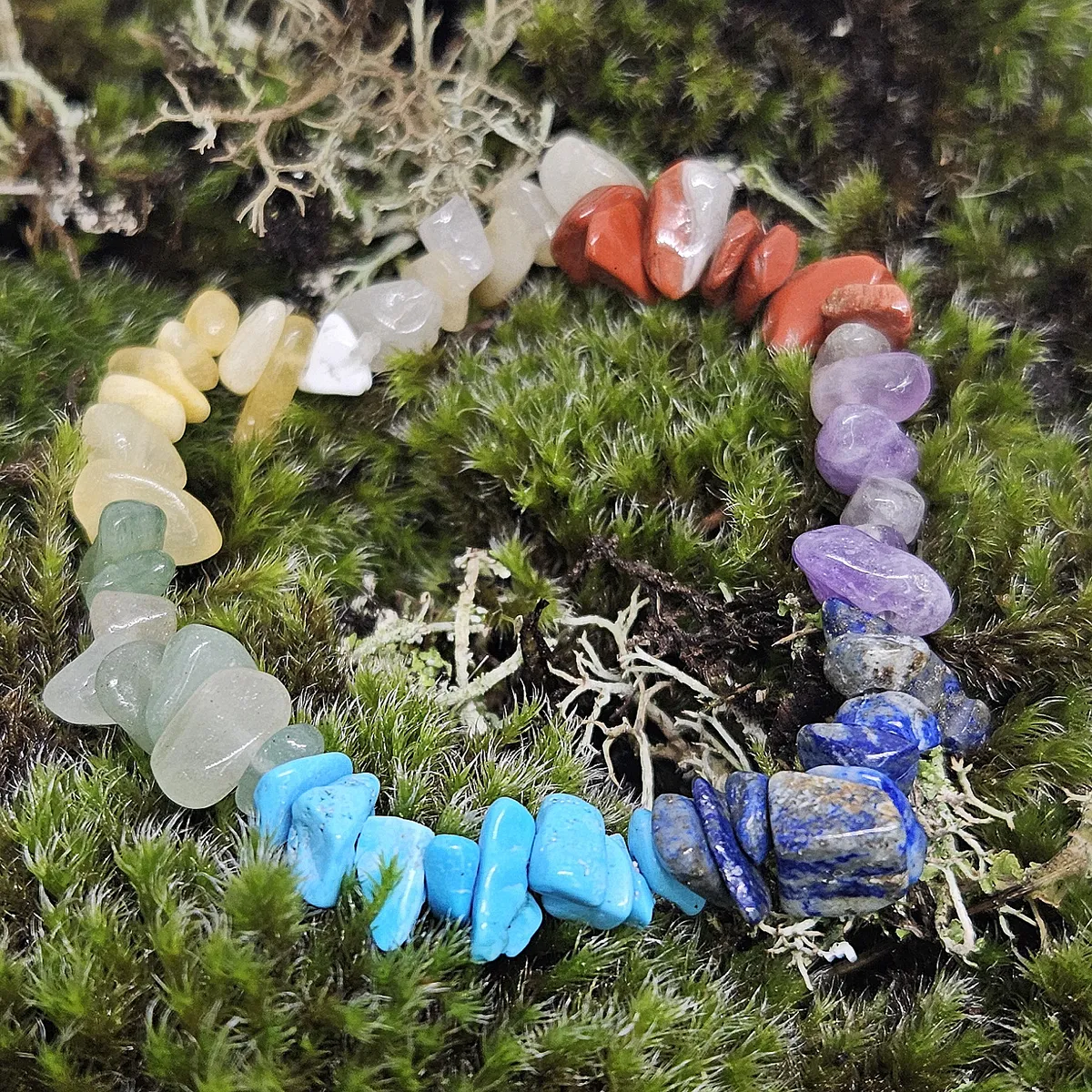 Ametist, Sodalite, Turquentine, Grön Aventurin, Gul Aventurin, Orange Kalcit och röd Jaspis.
