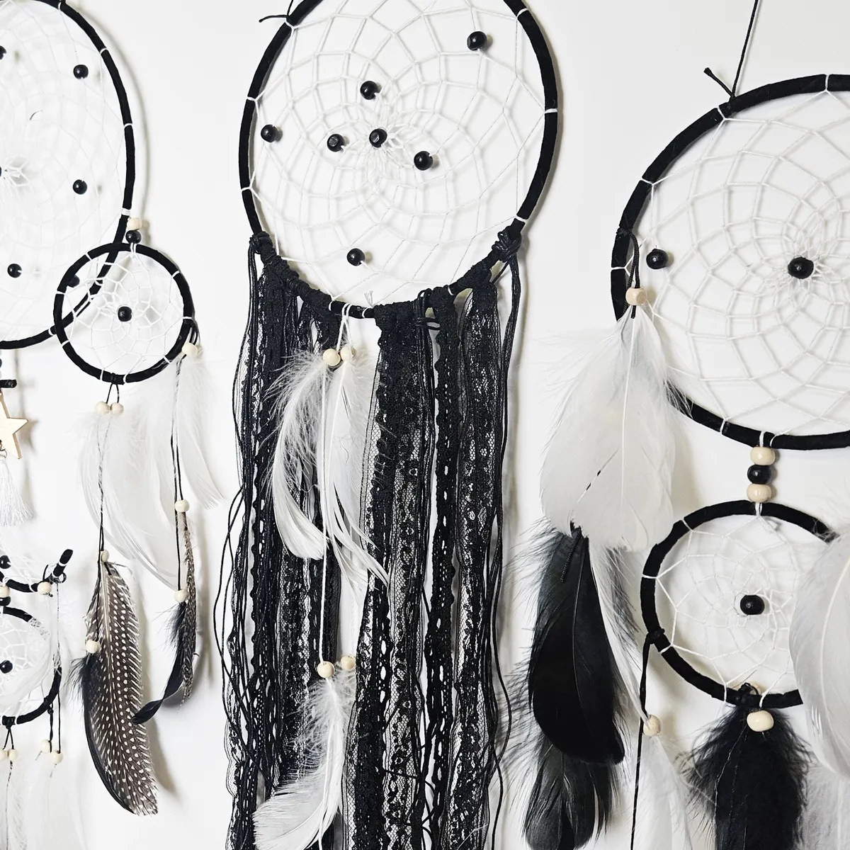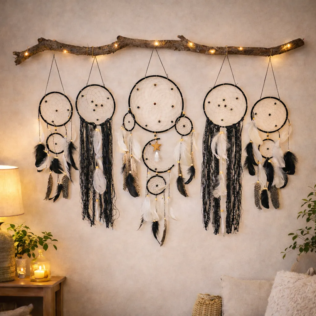 Vackert set med 5 st drömfångare i matchande design. Perfekt som väggdekoration. Observera att grenen och ljusslingan på bilden inte ingår!