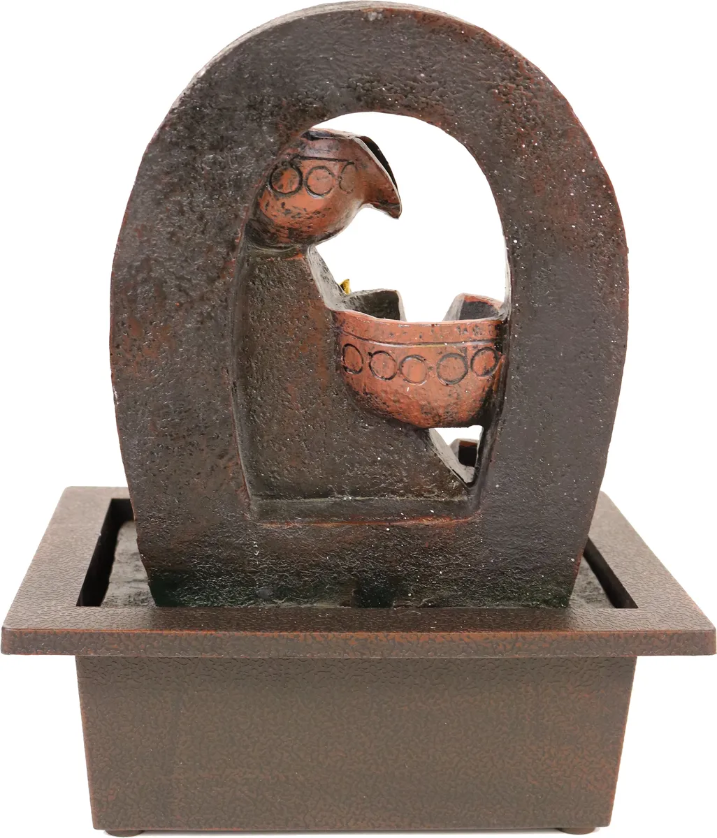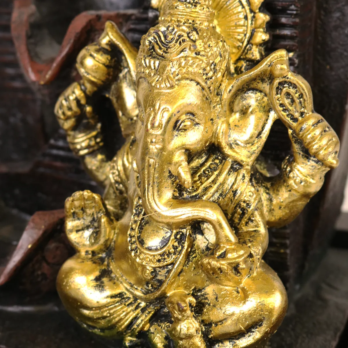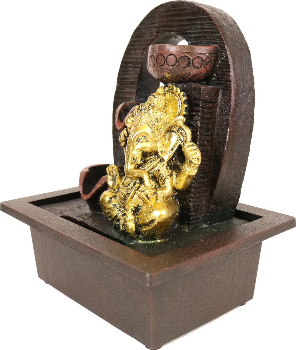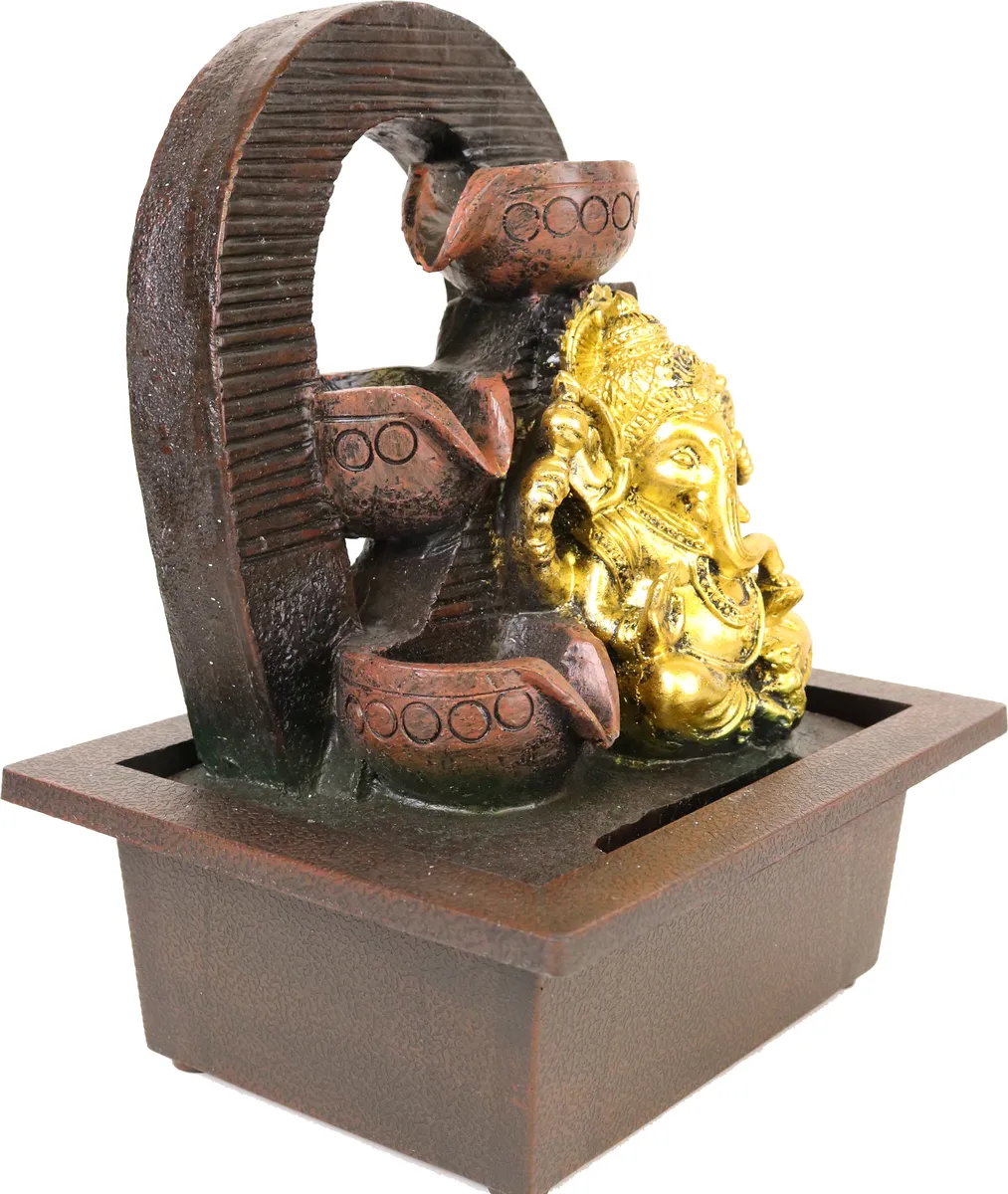 En fin fontän Ganesha där vattnet rinner från urnorna i tre fall, ner på en LED lampa är som lyser upp och ger en vacker ljusbild. Ett varmt och väldigt dekorativt effektfullt ljus.