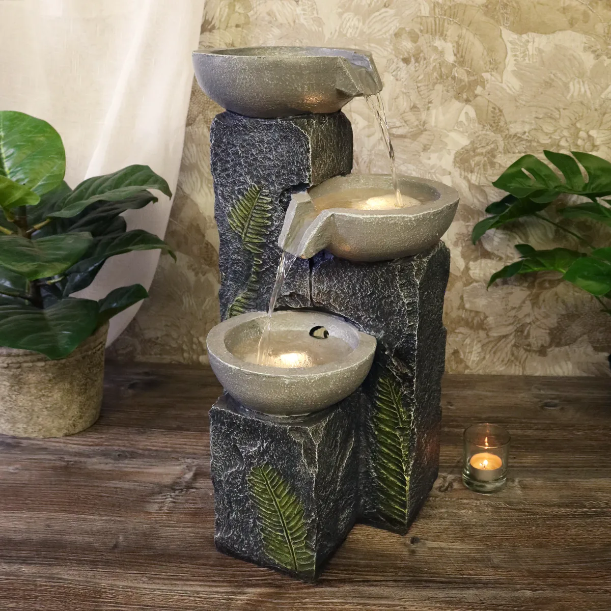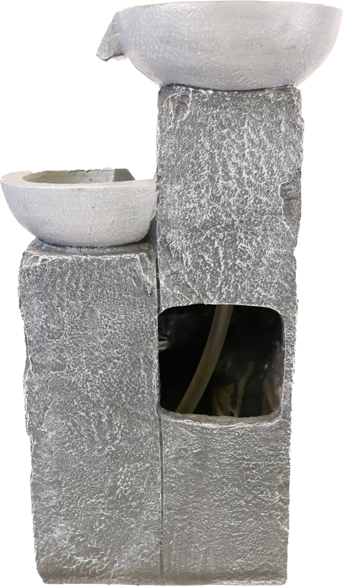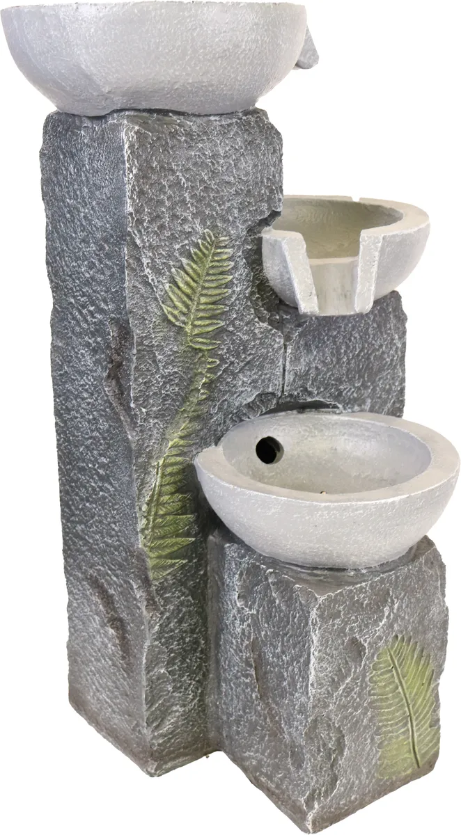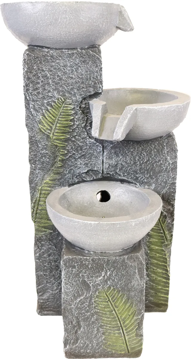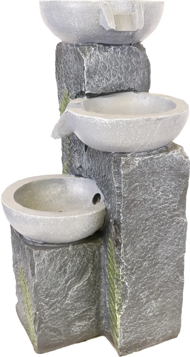 Denna fina moderna fontän med tre pelare med skålar där vattnet rinner ner i tre steg och ger ett härligt avslappnande ljud från det porlande vattnet. LED lampa som lyser upp under glaskulan ger ett varmt och väldigt dekorativt effektfullt ljus.