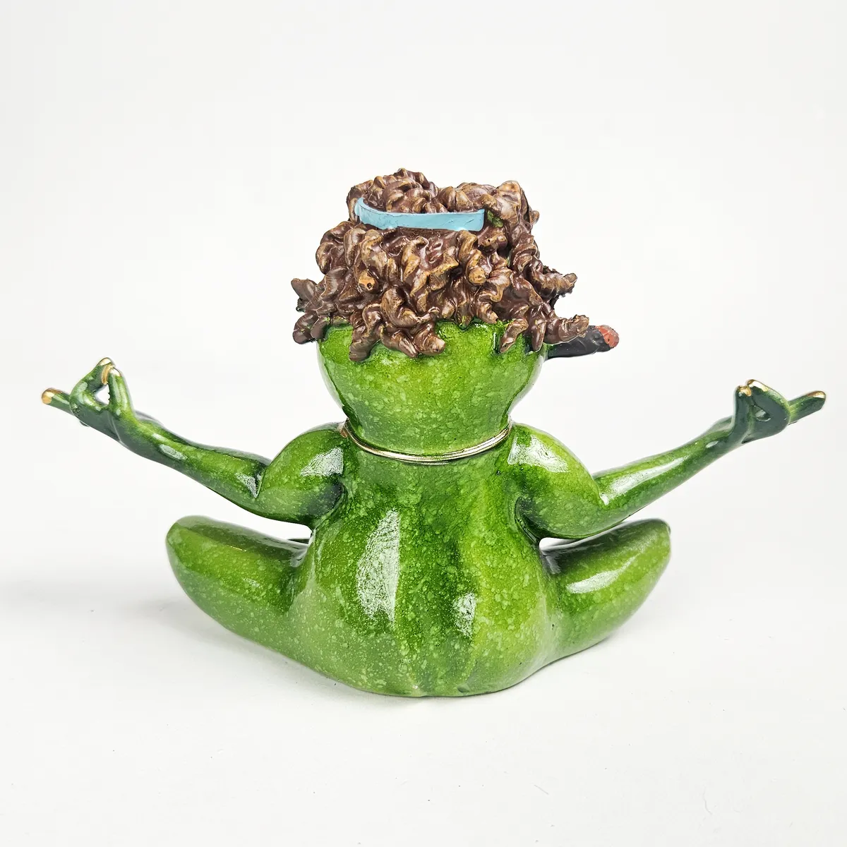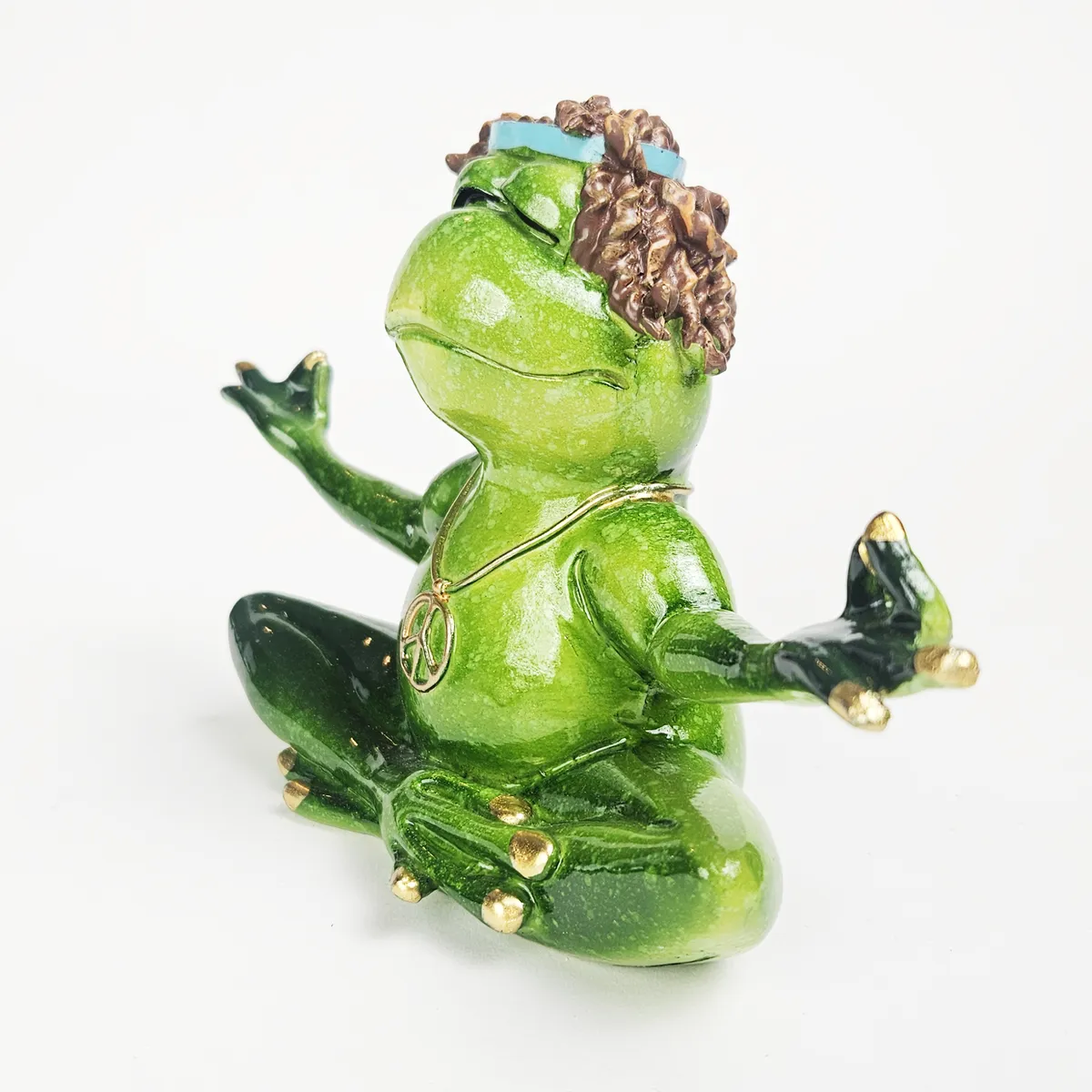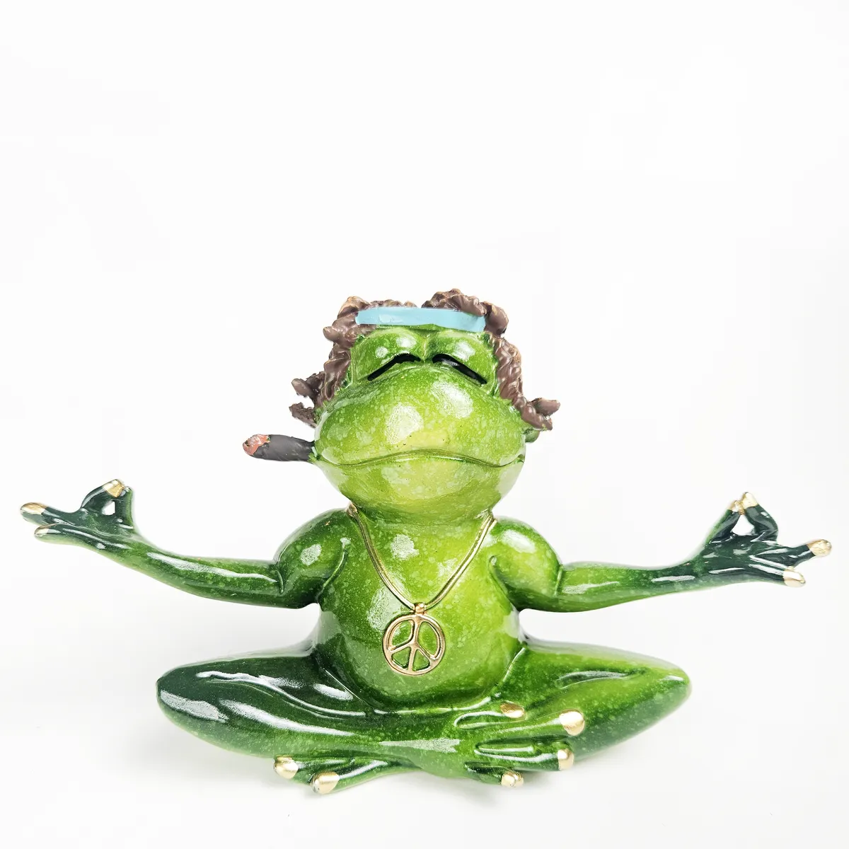 Groda i skräddarställning med peace symbol halsband och en joint i munnen. Handmålad prydnad med fina guld detaljer och härlig grön färg.