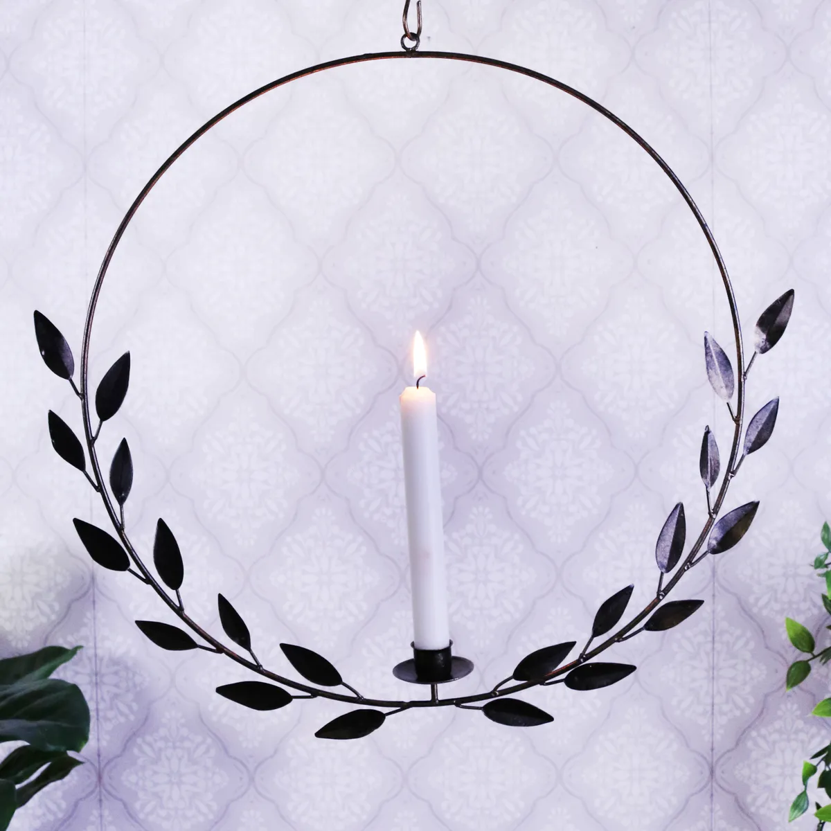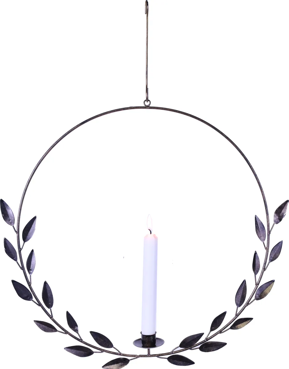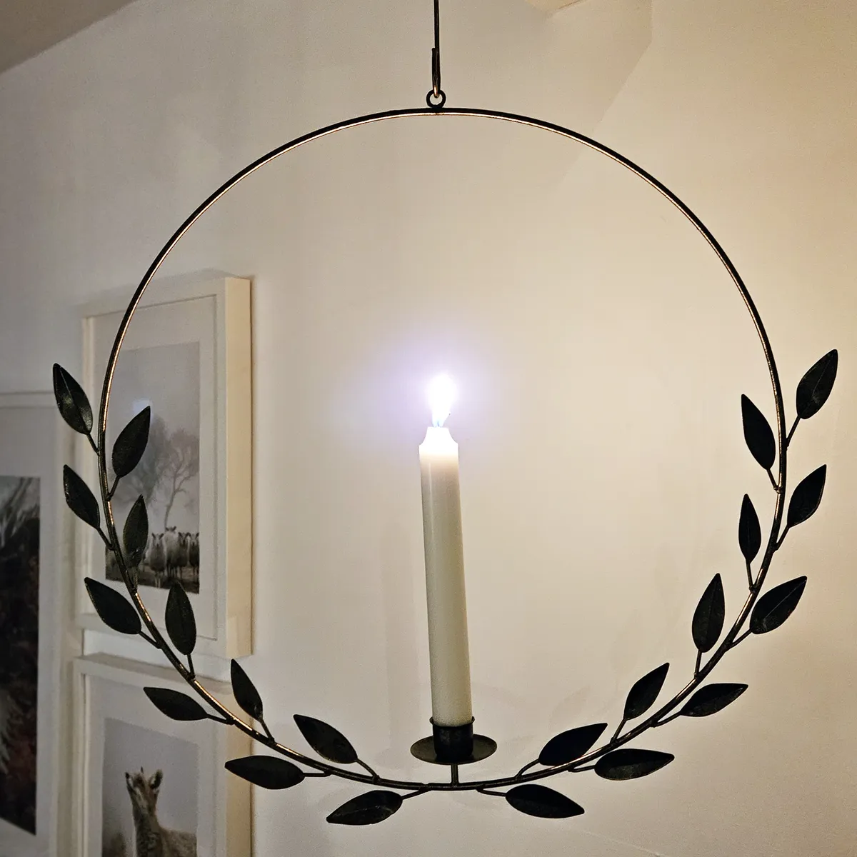 Vacker handgjord rund hängljusstake för antikljus i svart antikguld färg. Cirkeln har små blad i underkant som en fin detalj. Perfekt ljusstake att hänga i fönstret. Krok medföljer.