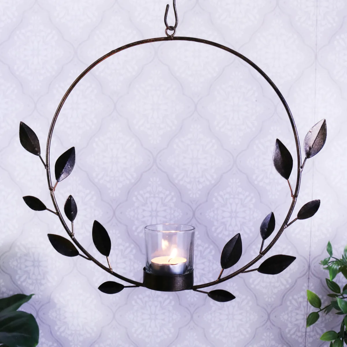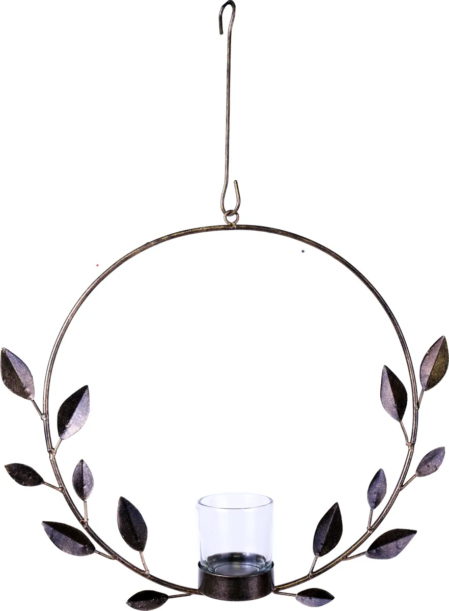 Vacker handgjord rund häng ljusstake för värmeljus i svart antikguld färg. Cirkeln har små blad i underkant som en fin detalj. Perfekt ljusstake att hänga i fönstret. Krok och glaskopp medföljer
