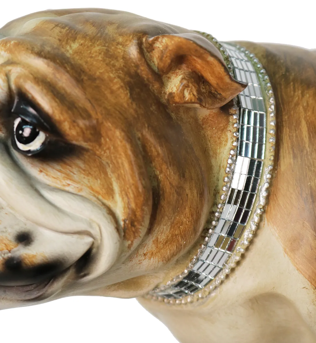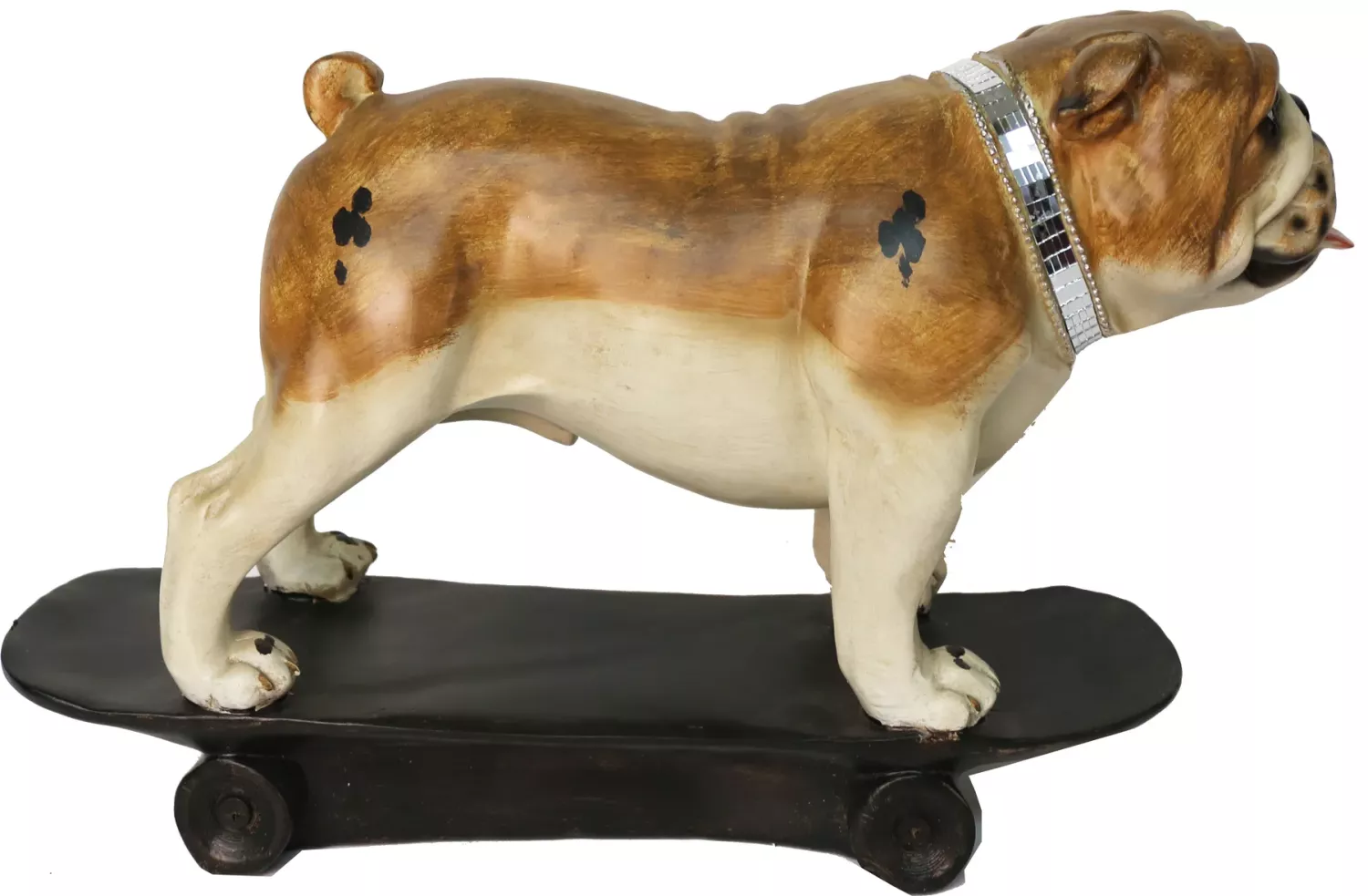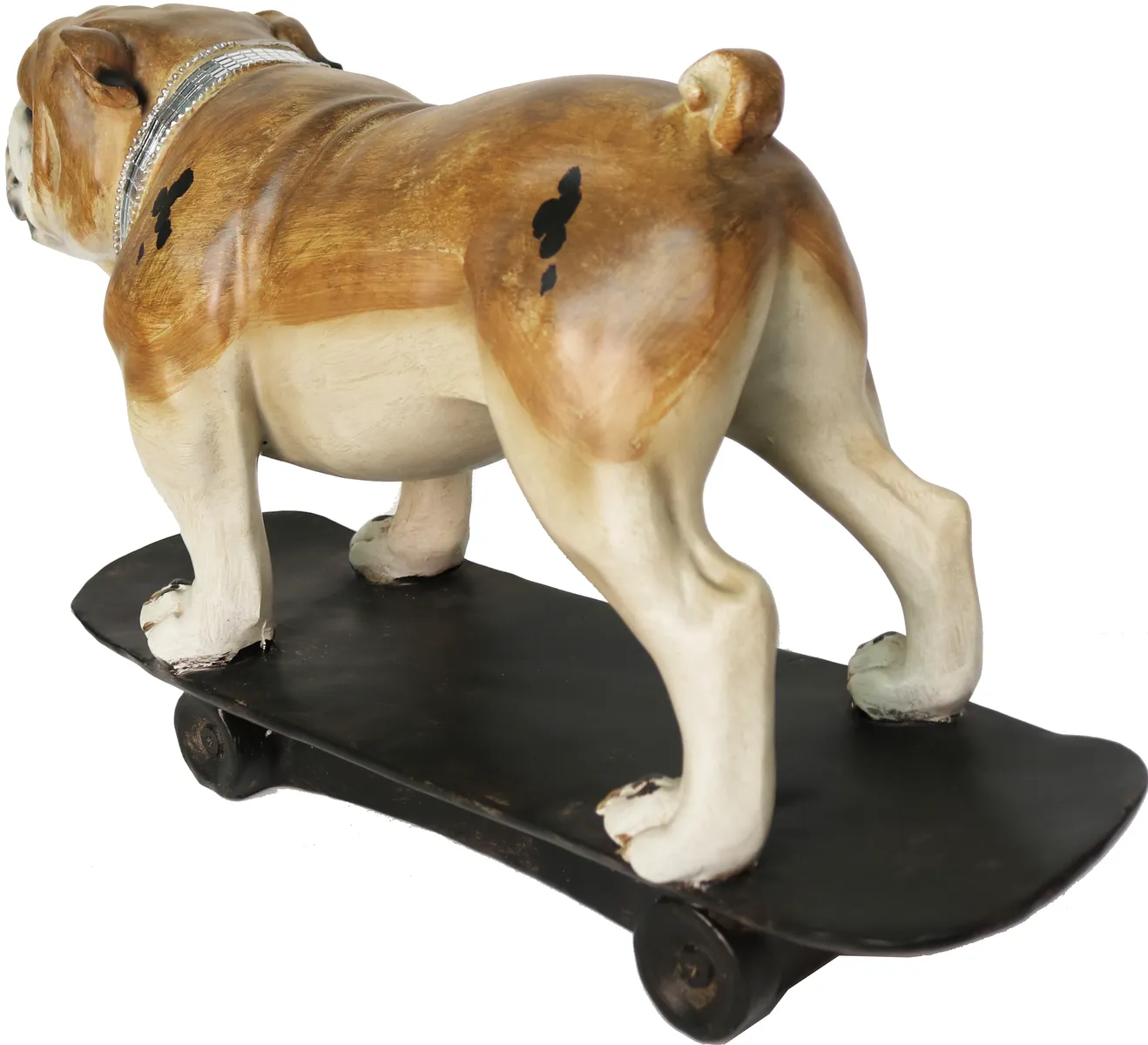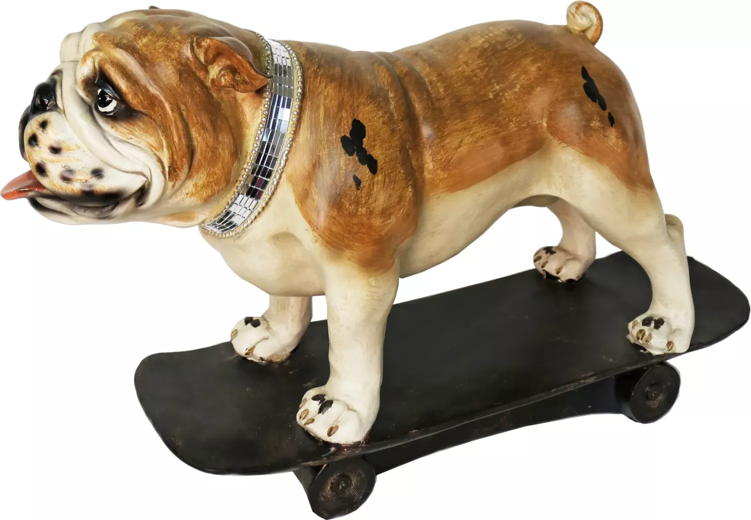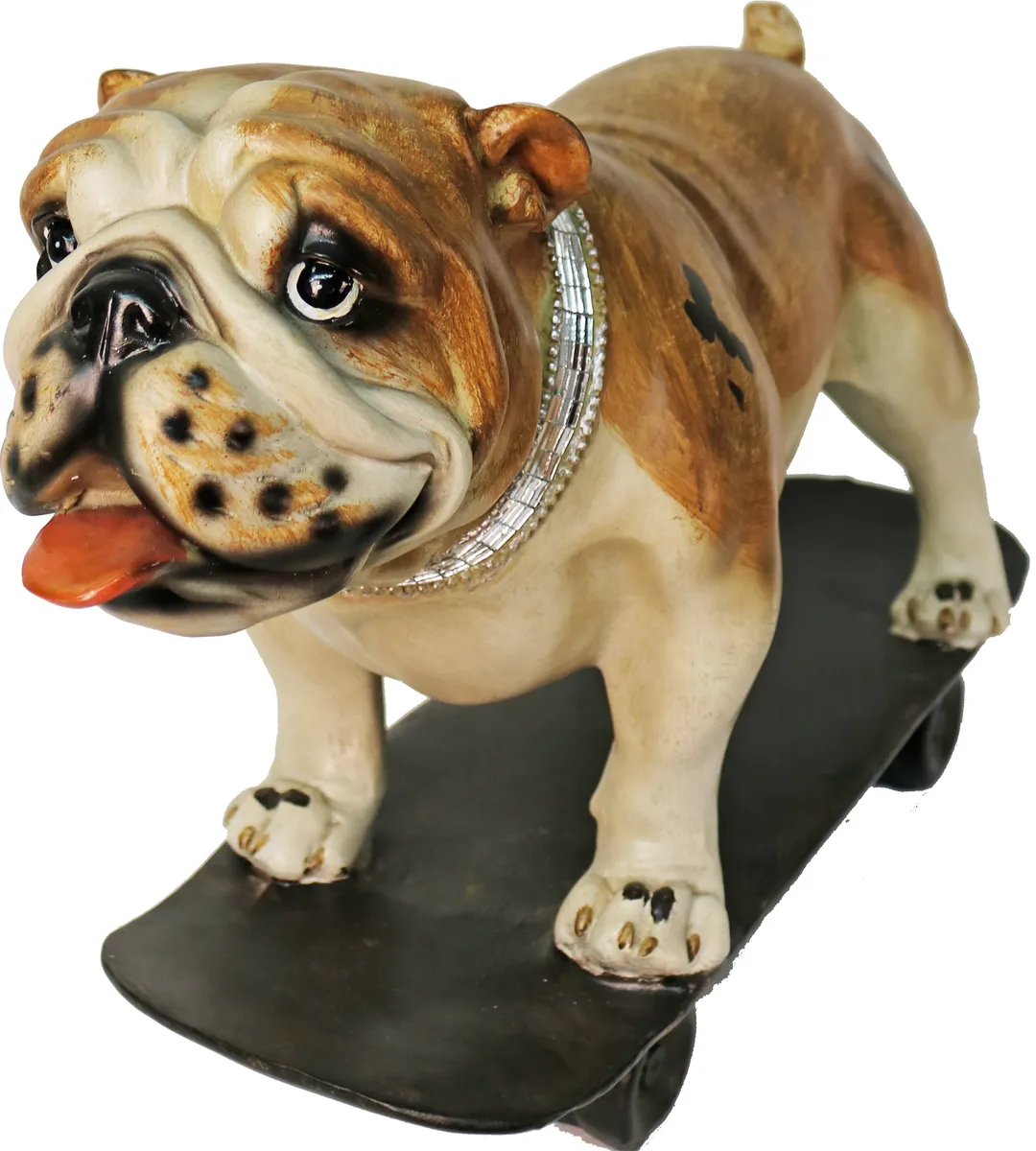 Unik dekorationsfigur i form av en cool hund som åker skateboard med tufft halsband i spegelglas. Denna inredningsdetalj ger en pampig känsla med attityd i hemmet. Perfekt till den som gillar design statyer och annorlunda inredning och prydnader, den som gillar hundar, skateboard figurer, street figurer, prydnadssaker, cool inredning. Denna ståtliga figur i hemmet kommer dra blickarna åt sig.