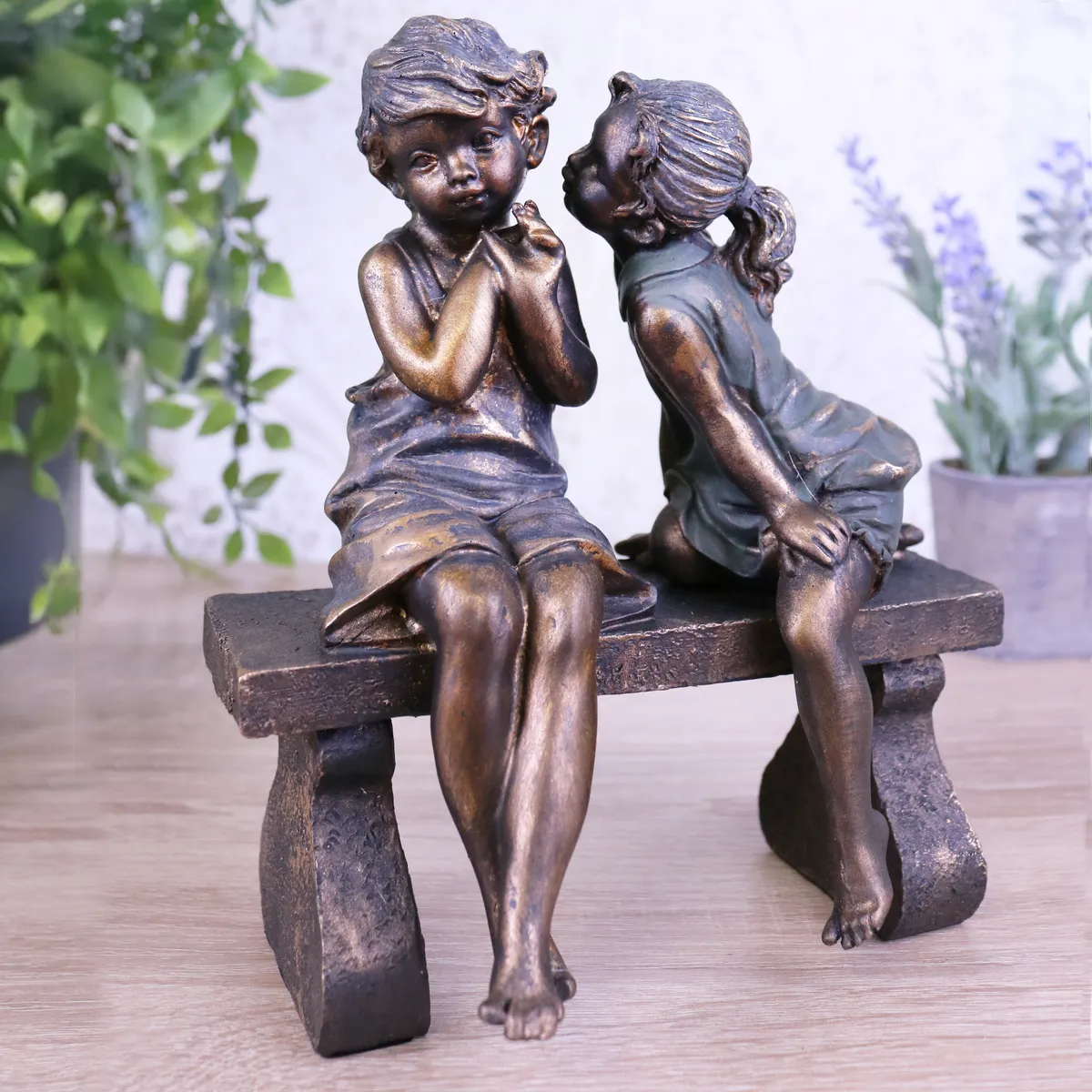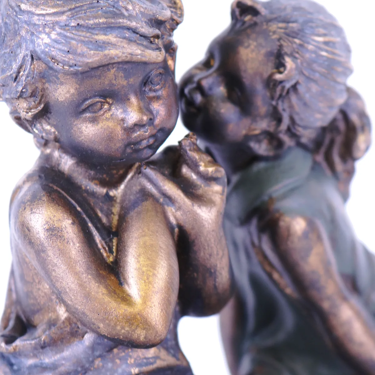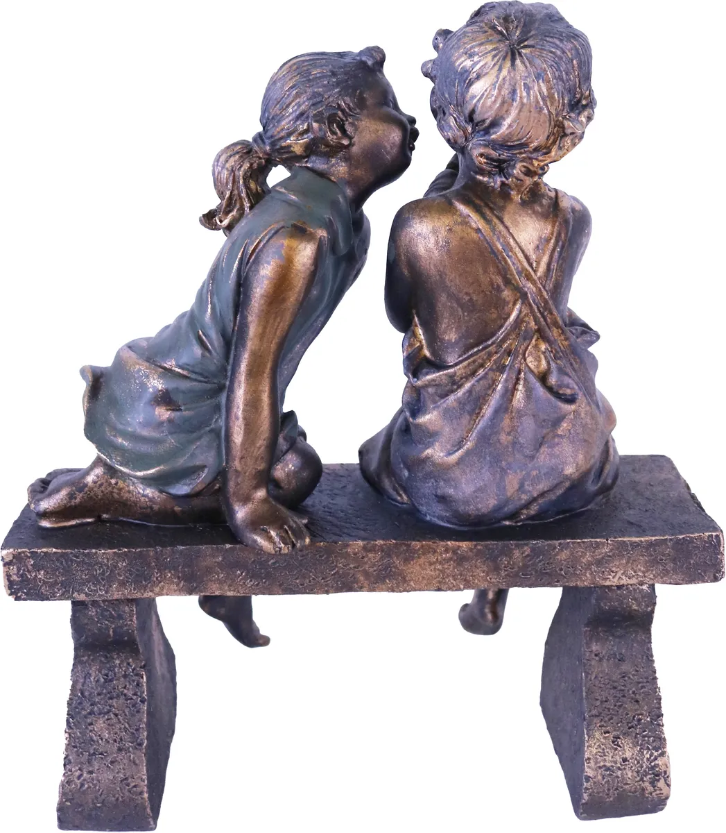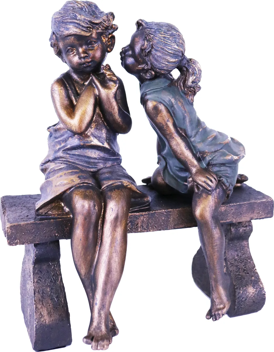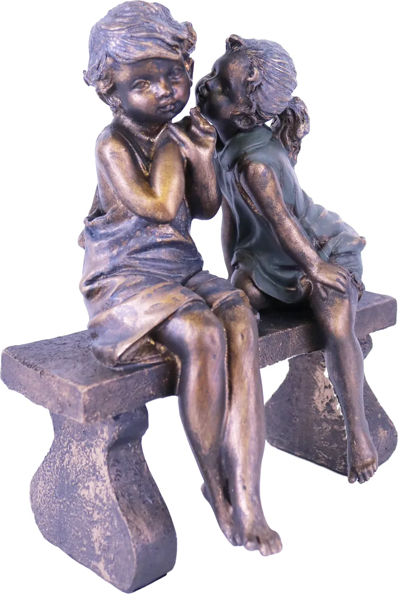 Fin skulptur av två barn på en bänk där tjejen försöker kyssa pojken. Figuren är i antik brons/grön färg för en mer exklusiv känsla.