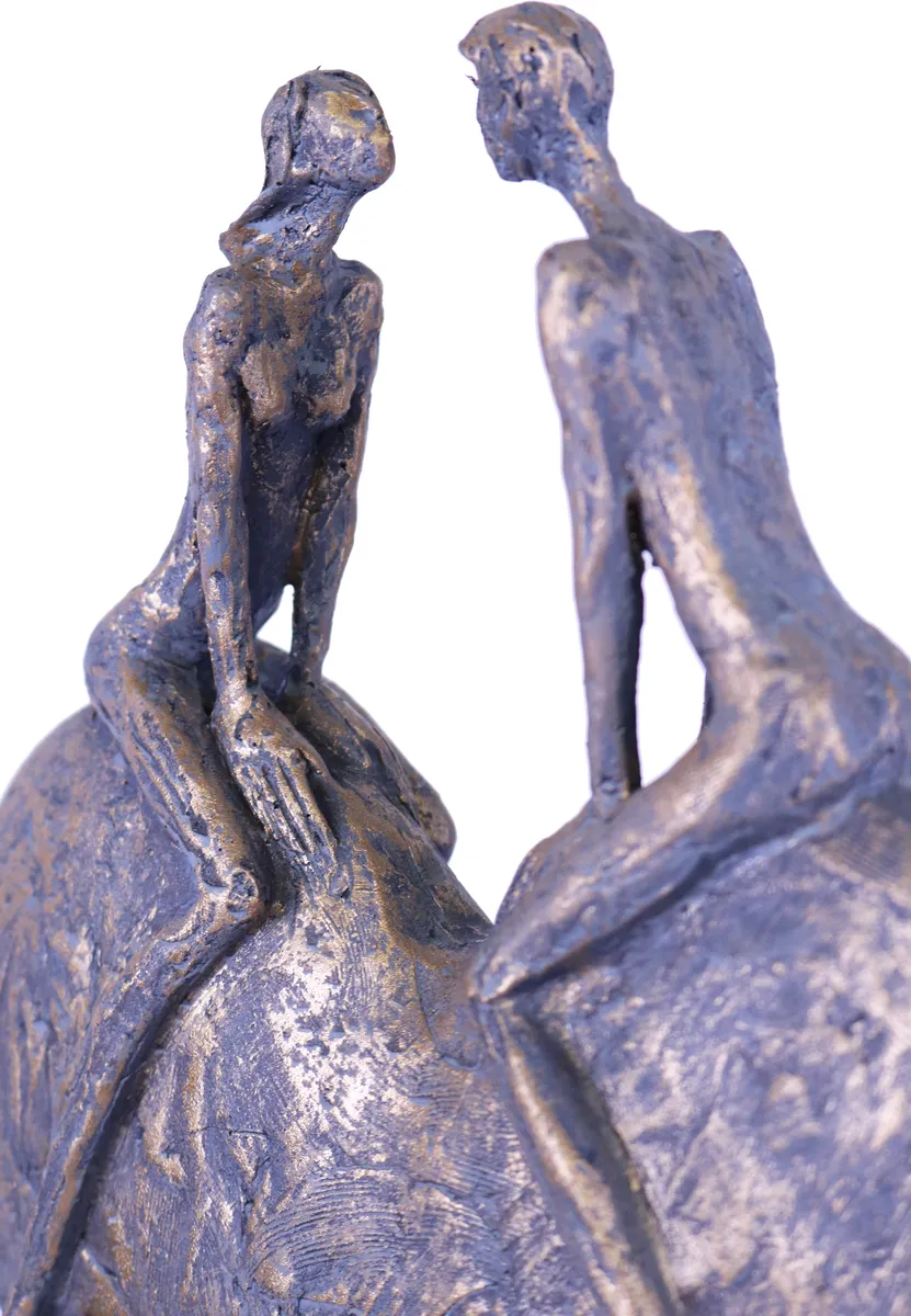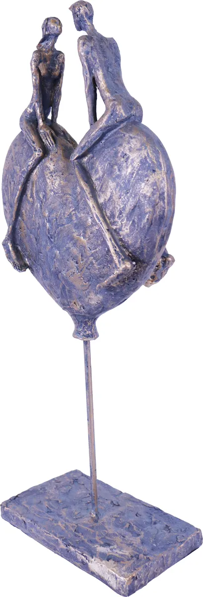 Snygg modern skulptur. Från bottenplattan går en tunn metallpinne upp som håller ett hjärta med ett kärlekspar i. Figuren är i grå/guld färg med ojämn yta, som att den är huggen ur sten, för en mer unik känsla. Perfekt för den som gillar annorlunda och modern konst. Perfekt som bröllopspresent.