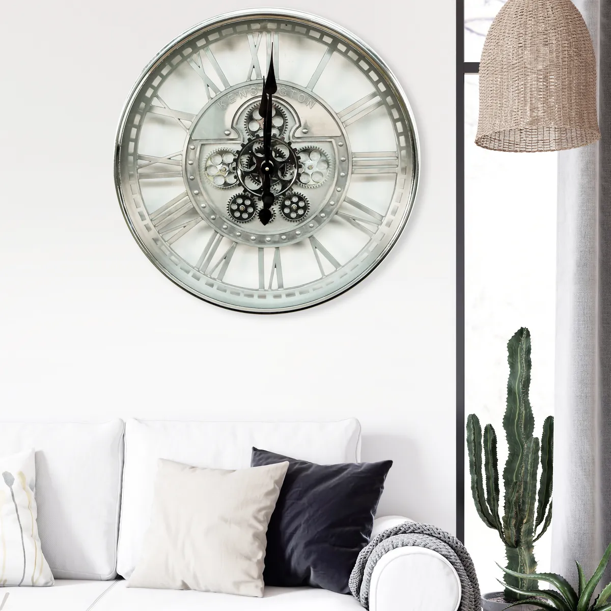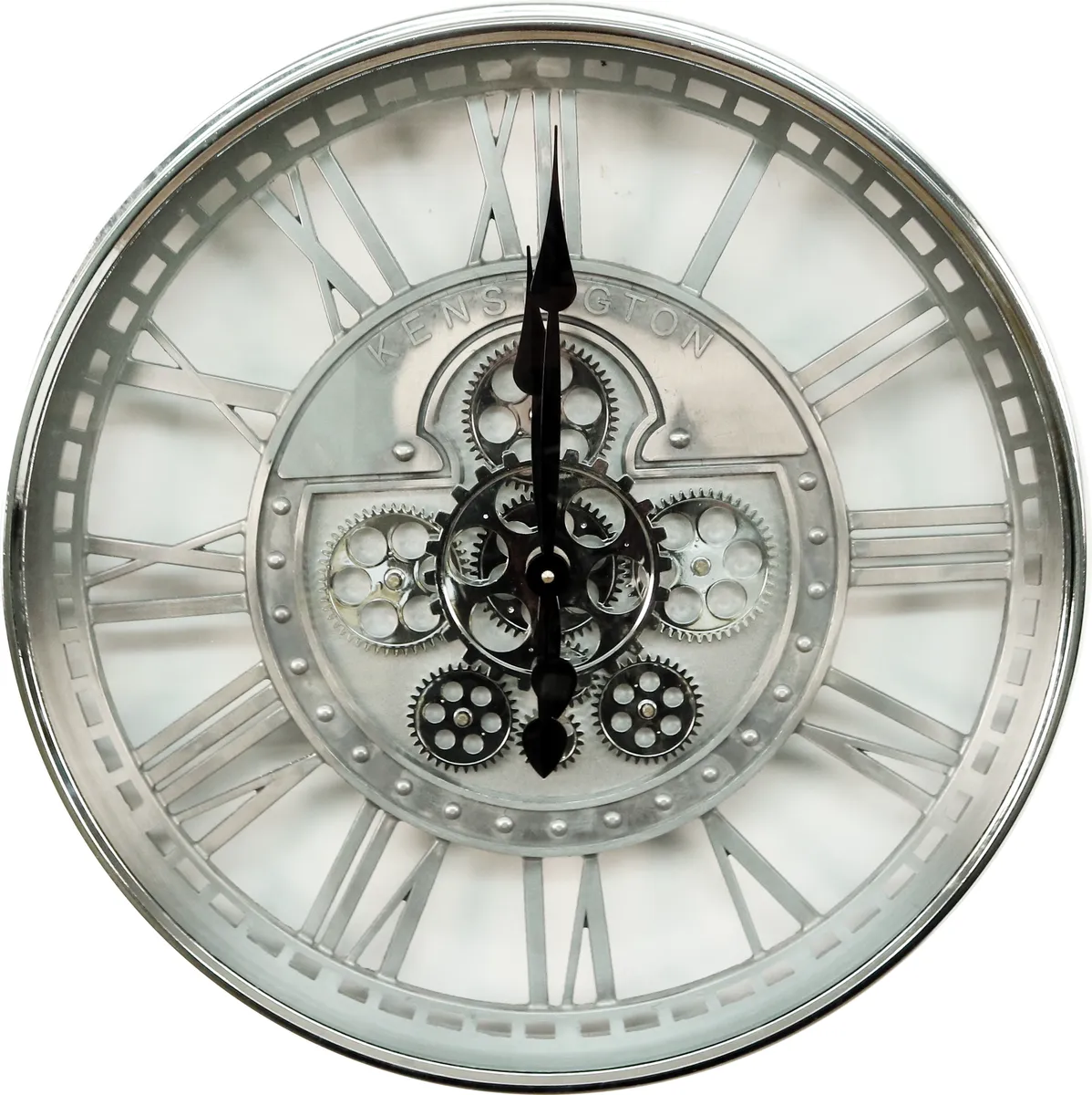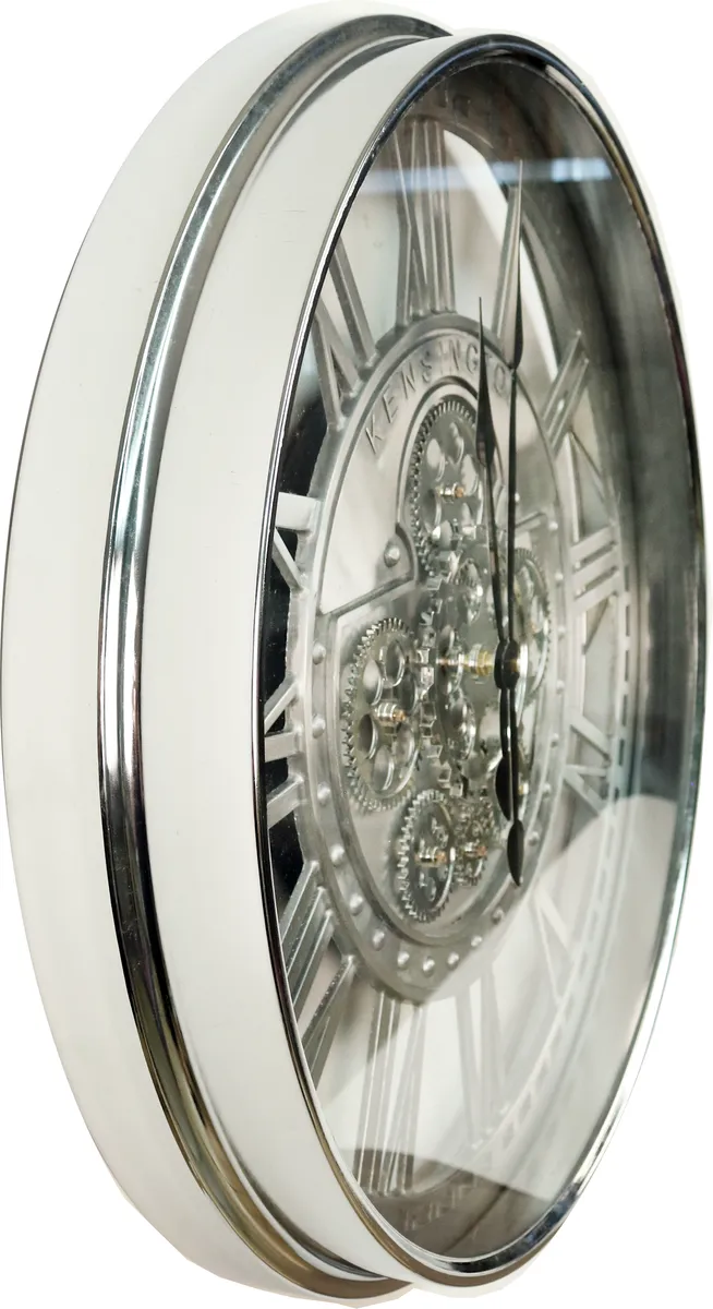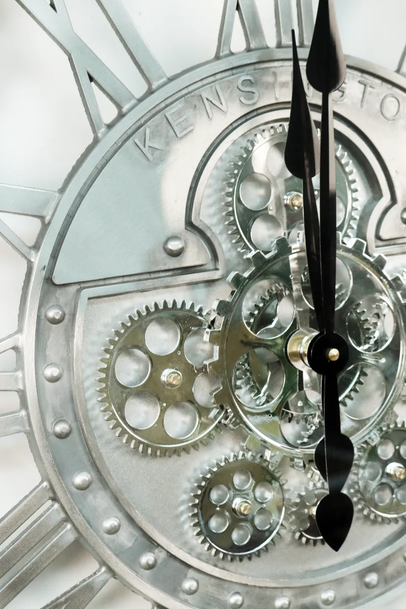 Cool väggklocka i silver färg med tydliga romerska siffror. Vägguret har flera kugghjul som går runt i varandra med hjälp av 2st AA batterier en snygg detalj som ger en unik industriell klocka. OBS! Batteri ingår ej!