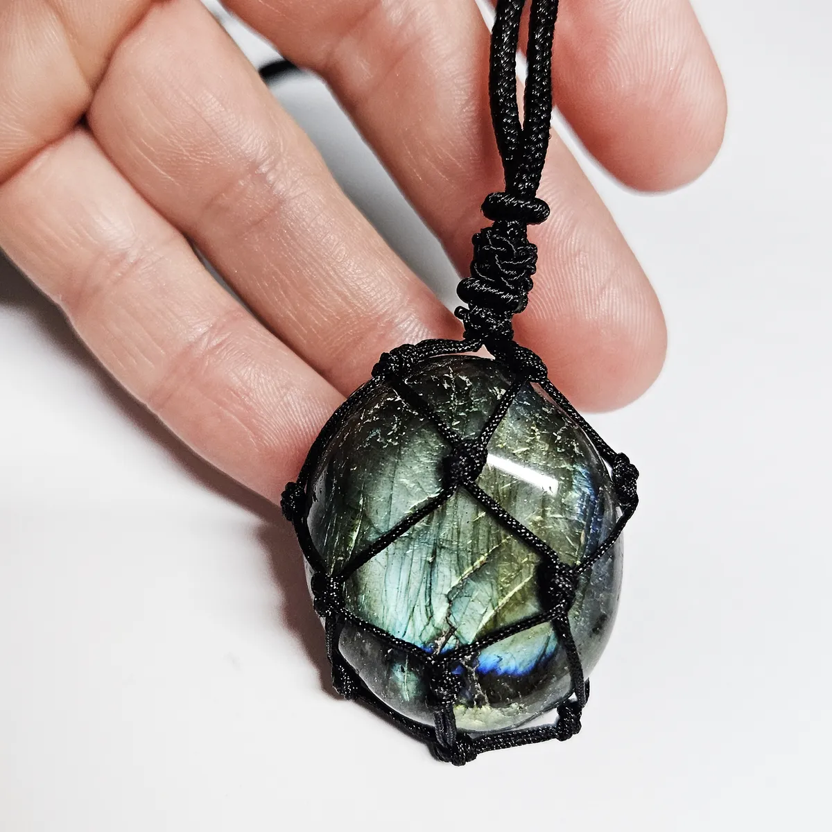 Varje kristall är unik, handpolerad och omsluten i ett snyggt makraméhölje med justerbart band, så du enkelt kan anpassa längden efter din stil. Kristallen är cirka 3–4 cm stor, vilket gör den perfekt att bära både till vardags och vid speciella tillfällen.
