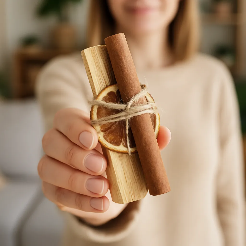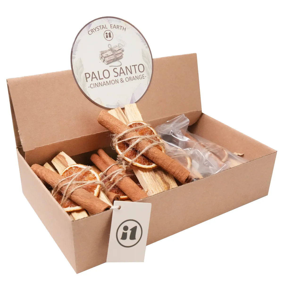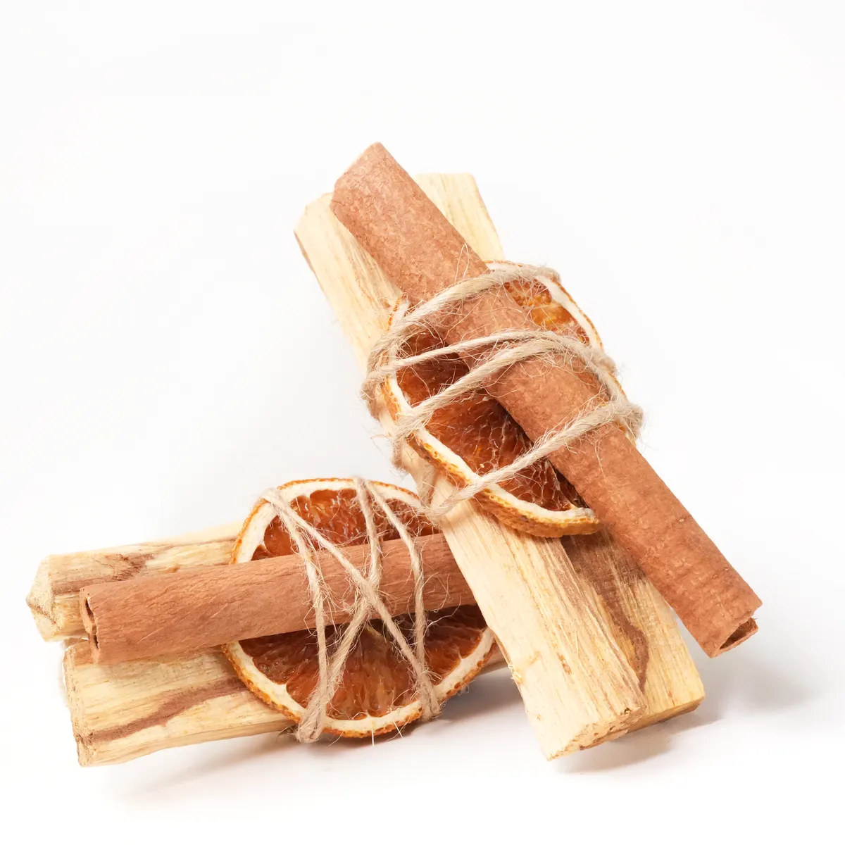 Två Palo Santo-pinnar, bunden med en torkad apelsinskiva och en kanelstång, förenar rening med värme och glädje. Palo Santo används traditionellt för att rensa energi och bjuda in harmoni, apelsin sprider friskhet och livsglädje, medan kanel ger en varm och beskyddande doft. En balanserad kombination som skapar en inbjudande och positiv atmosfär i hemmet eller vid ceremonier.