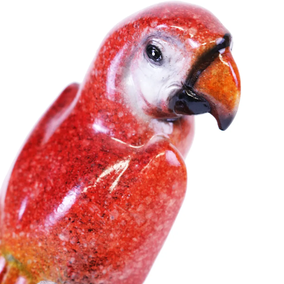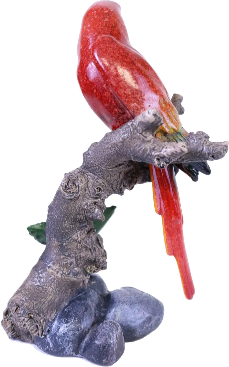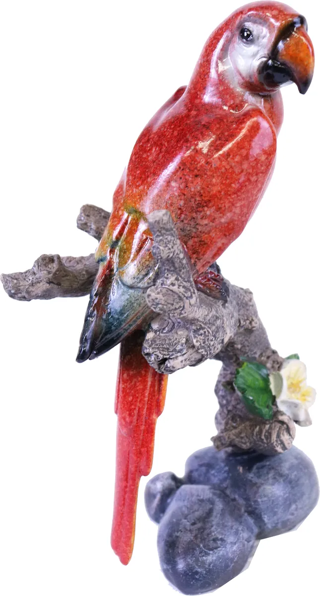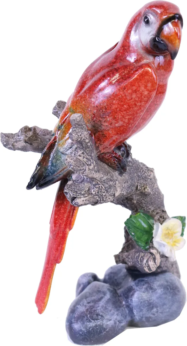 Fantastiskt fin röd papegoja som sitter på en trädgren. Handmålad med underbara, naturtrogna färger.