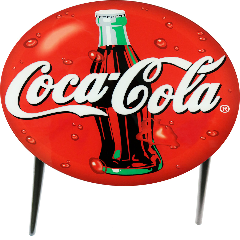 Snyggt retro glasbord i klassisk Coca Cola stil. Bordet har tre ben i metall som skruvas på under glasskivan. Perfekt till den som gillar cool retro inredning hemma eller i baren.