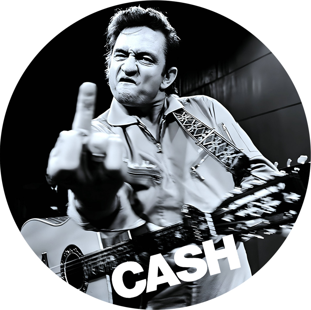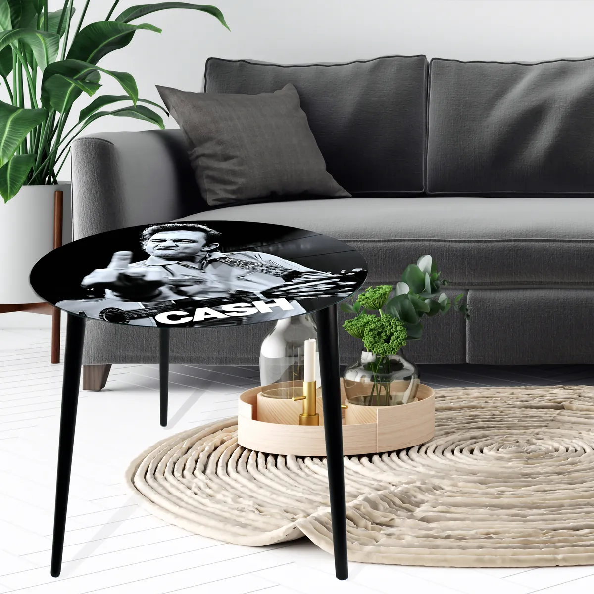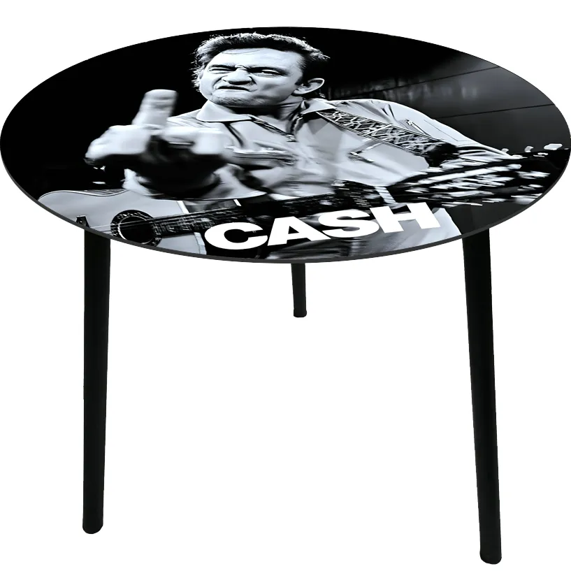Snyggt retro glasbord med motiv av Johnny Cash med sin gitarr och pekar ”Fuck You”. Bordet har tre ben i metall som skruvas lätt på under glasskivan. Perfekt till den som gillar cool retro inredning hemma, i baren eller i garaget. Till den som gillar 50’s och 60’s musik och stil.