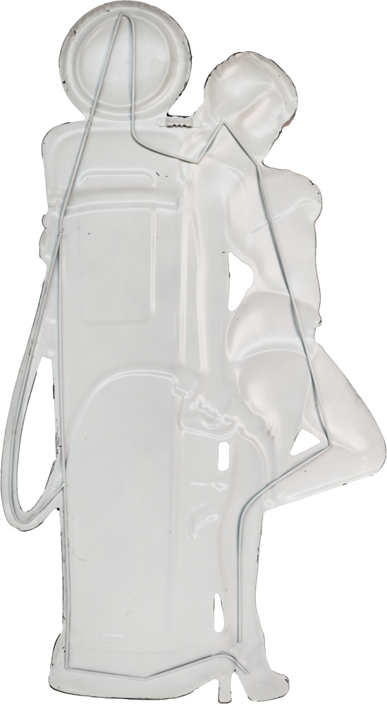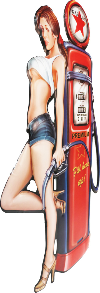 Metalltavla med en snygg pin up tjej bredvid en gammal bensinpump med texten ”Gasoline premium, Fill here up”. Perfekt till den som gillar bilar, oldies, MC, meka, inredning till garaget, eller till den som gillar gamla retro reklamskyltar.