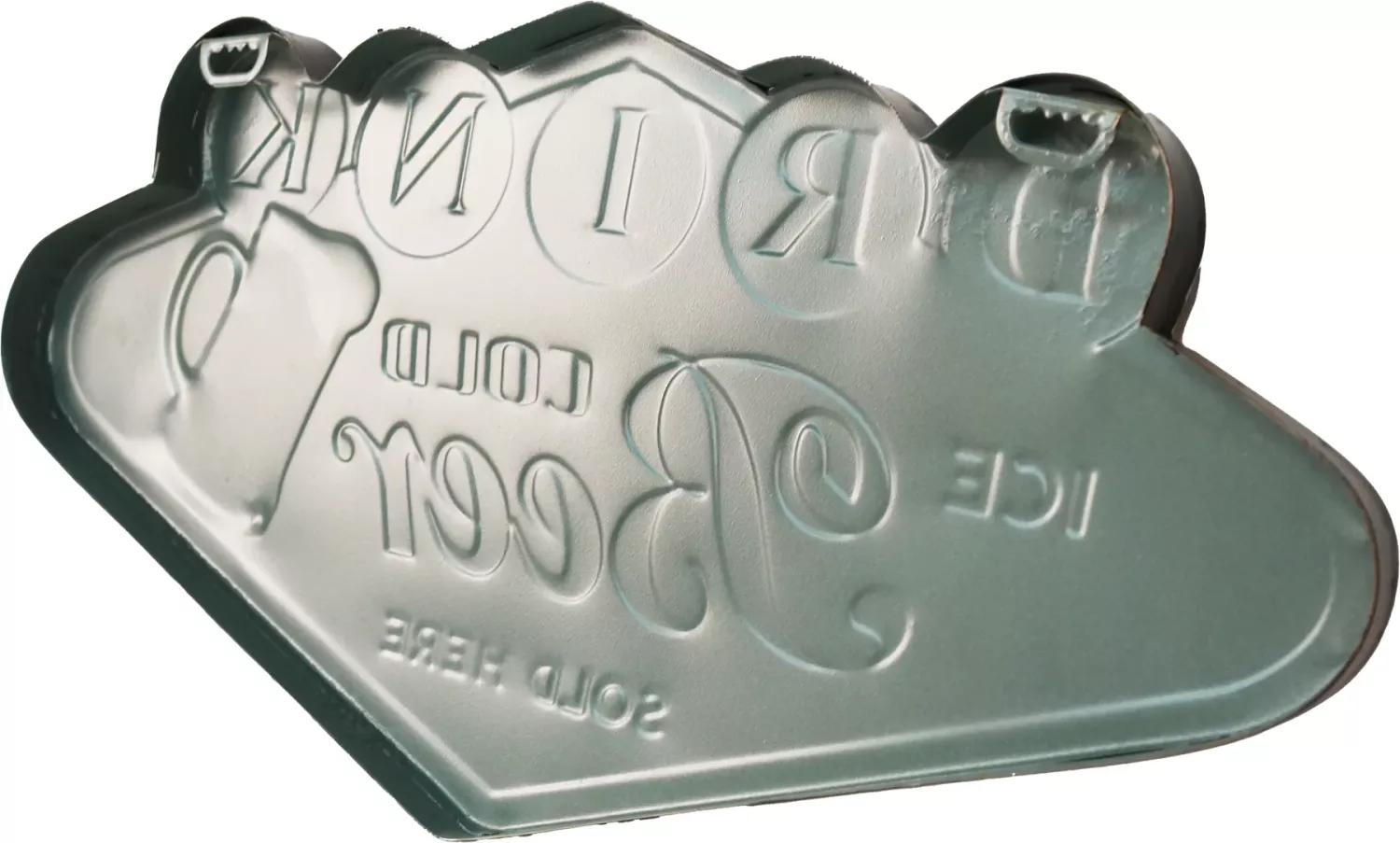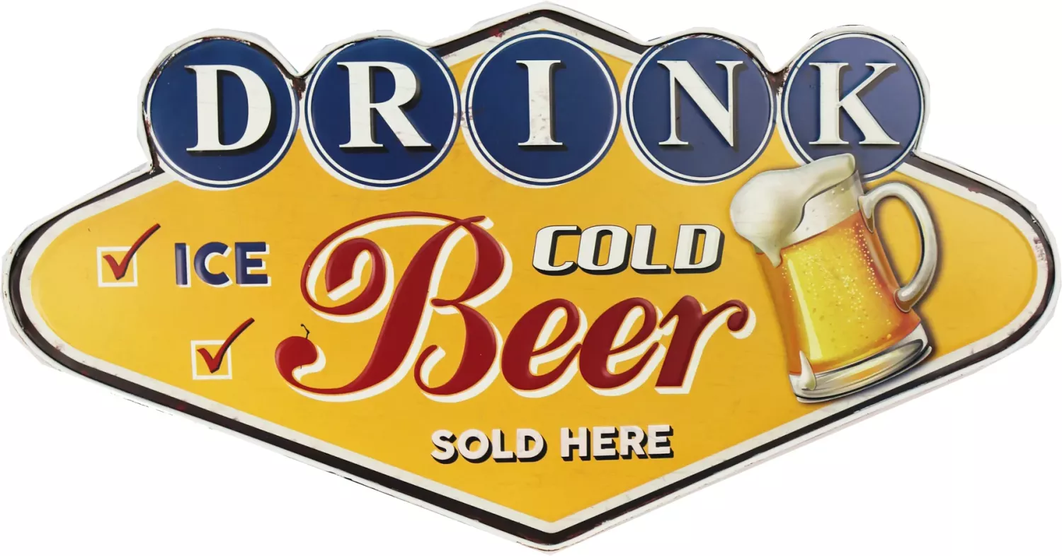 Metalltavla med texten ”Drink ice cold beer, sold here”. med ett ölglas på. Perfekt till baren, till den som älskar öl eller till den som gillar gamla retro reklamskyltar.