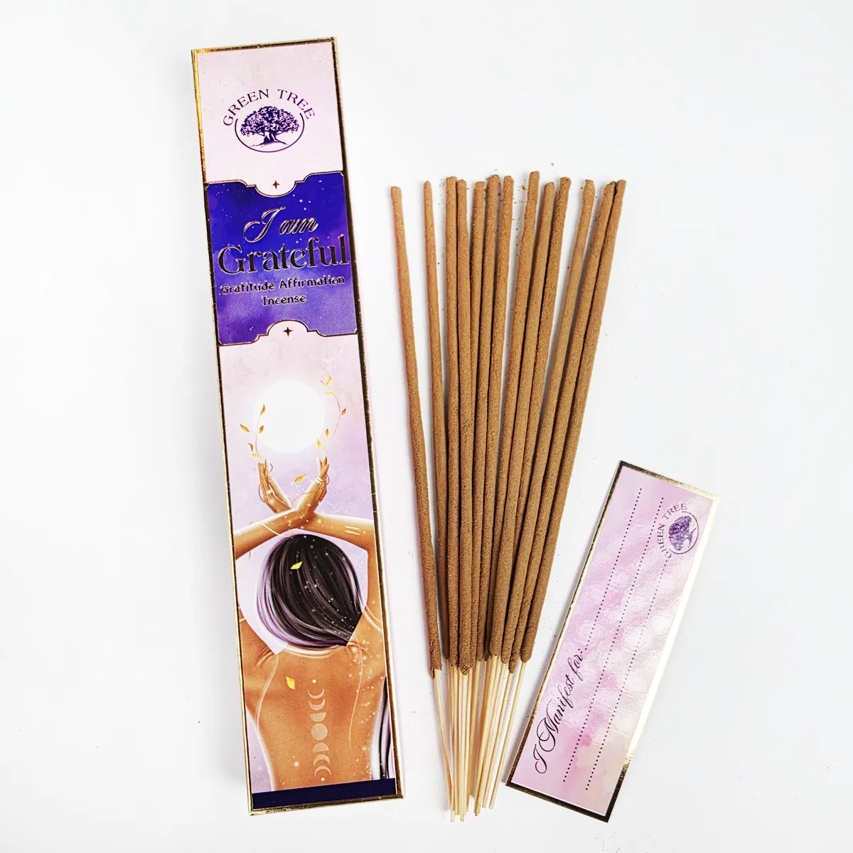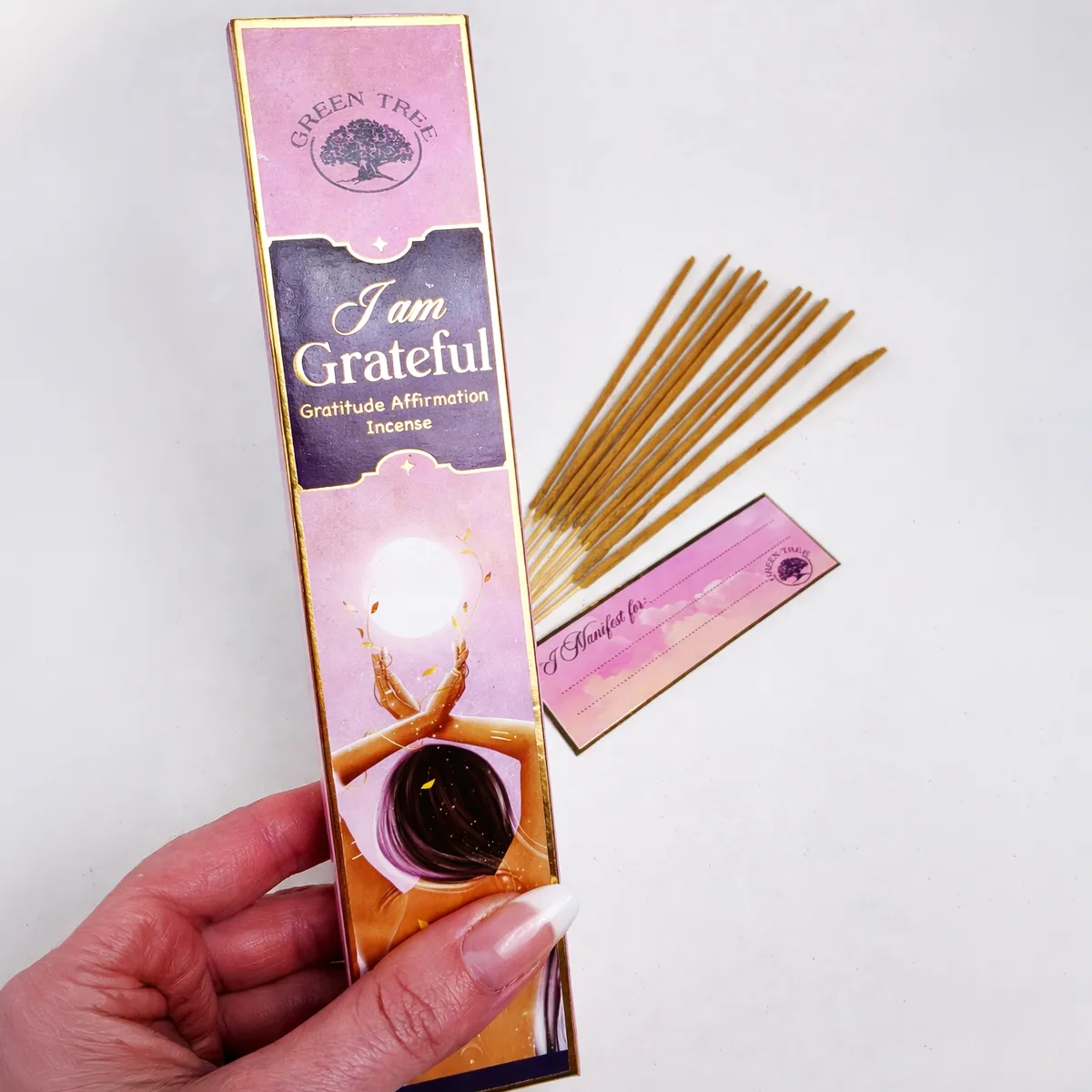I Am Grateful, Naturlig rökelse för tacksamhet och inre balans. Denna rökelse från Green Tree med affirmationen “I Am Grateful” är skapad för att bidra till en lugn och harmonisk atmosfär i hemmet. Doften är mjuk, varm och balanserad, perfekt för stunder av reflektion, närvaro och stillhet.