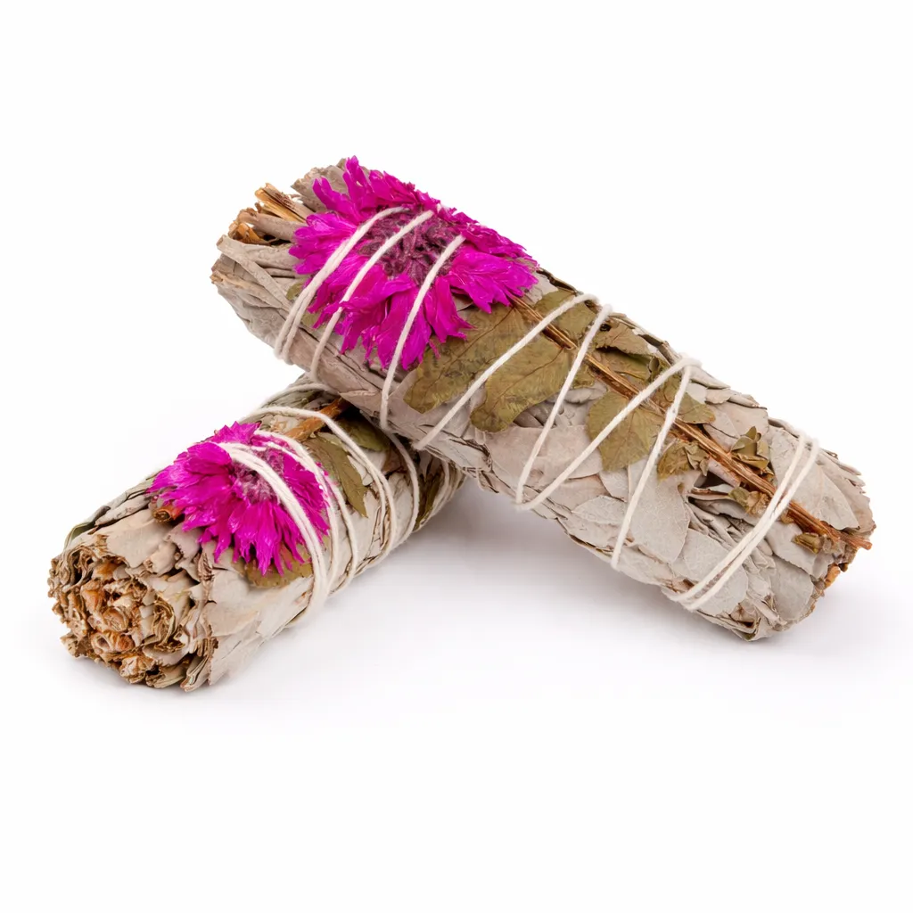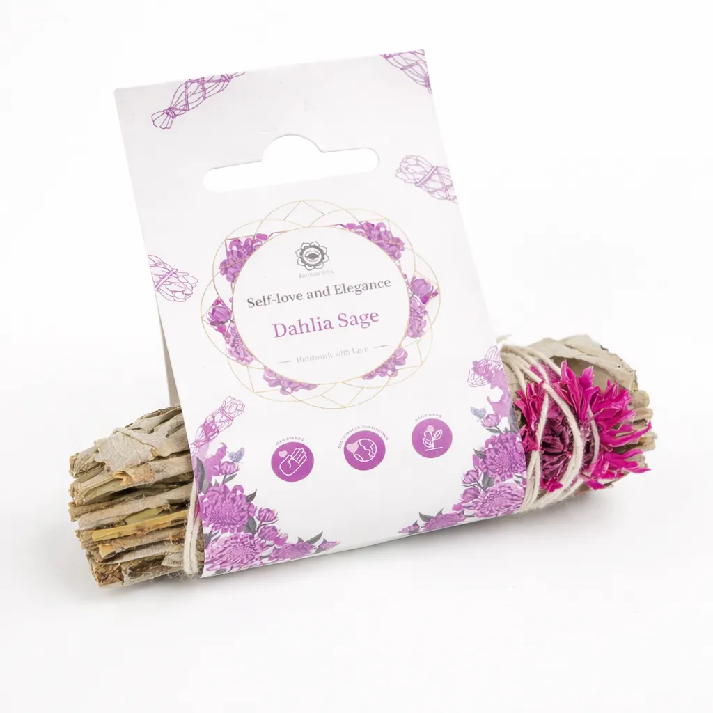 Self Love and Elegance Dahlia Sage, Naturlig smudge för balans och mjuk energi. Denna handbundna smudge av vit salvia med dahlia och dekorativa blommor är en vacker och naturlig produkt som kombinerar klassisk salvia med ett mjukare, mer elegant uttryck. Salvian ger en torr och örtig grund, medan blommorna tillför en lätt blommig och mild ton.