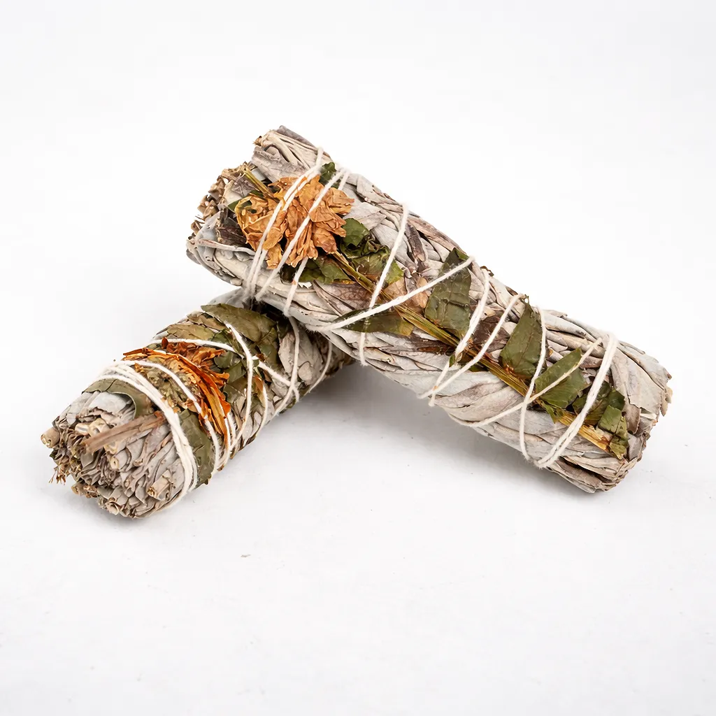 . Denna handbundna smudge av vit salvia med dekorativa örter är ett naturligt och stilrent val för dig som vill skapa en lugn och balanserad atmosfär i hemmet. Salvian ger en klassisk torr och örtig doft, medan de naturliga inslagen tillför en mjukare och mer behaglig helhet.