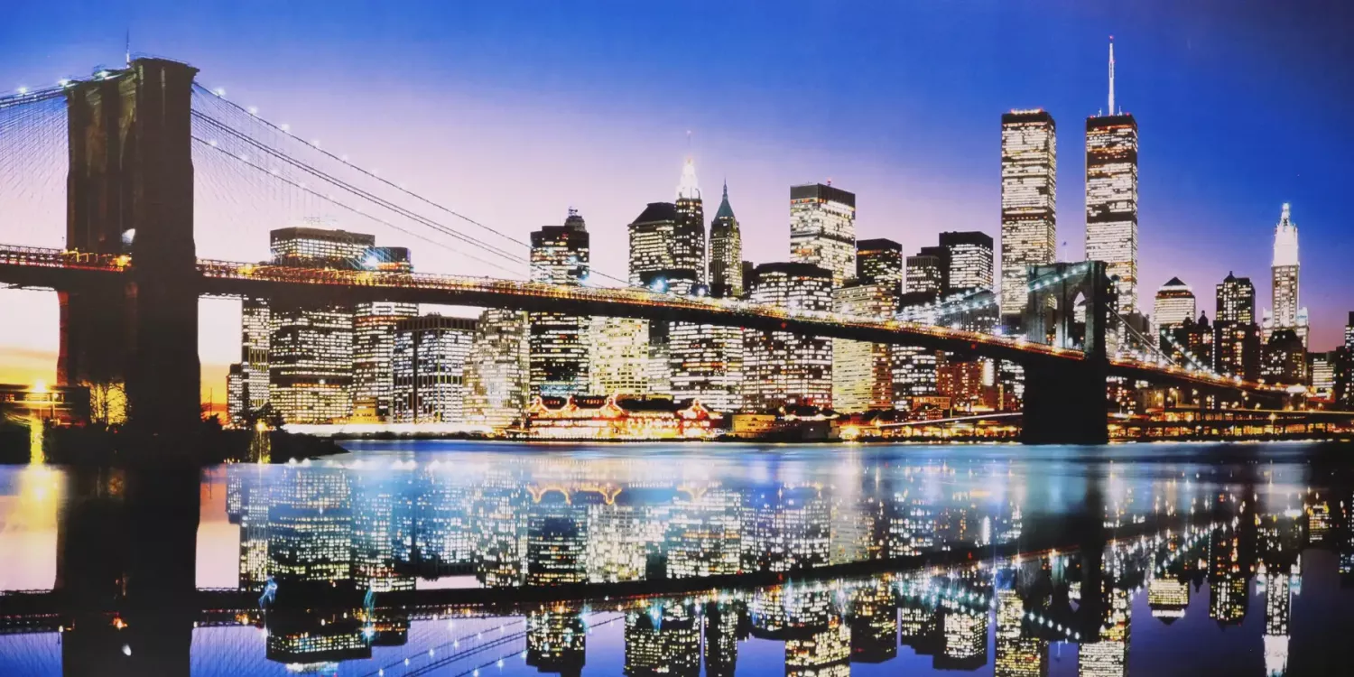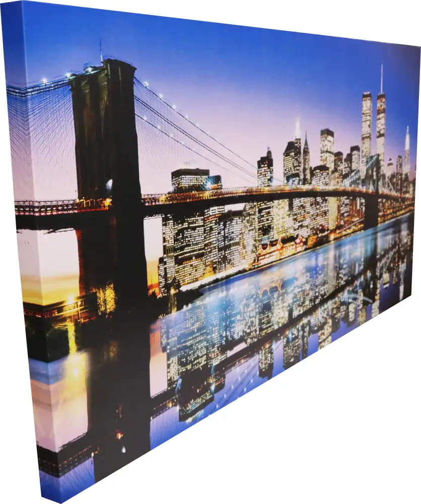 Printad canvastavla på högkvalitativ canvasduk med tryck av Brooklyn Bridge med staden New York i bakgrunden. Tavlan är uppspänd på 38mm kilram, där duken går över kilramen så den inte syns, redo för upphängning. Krokar medföljer.