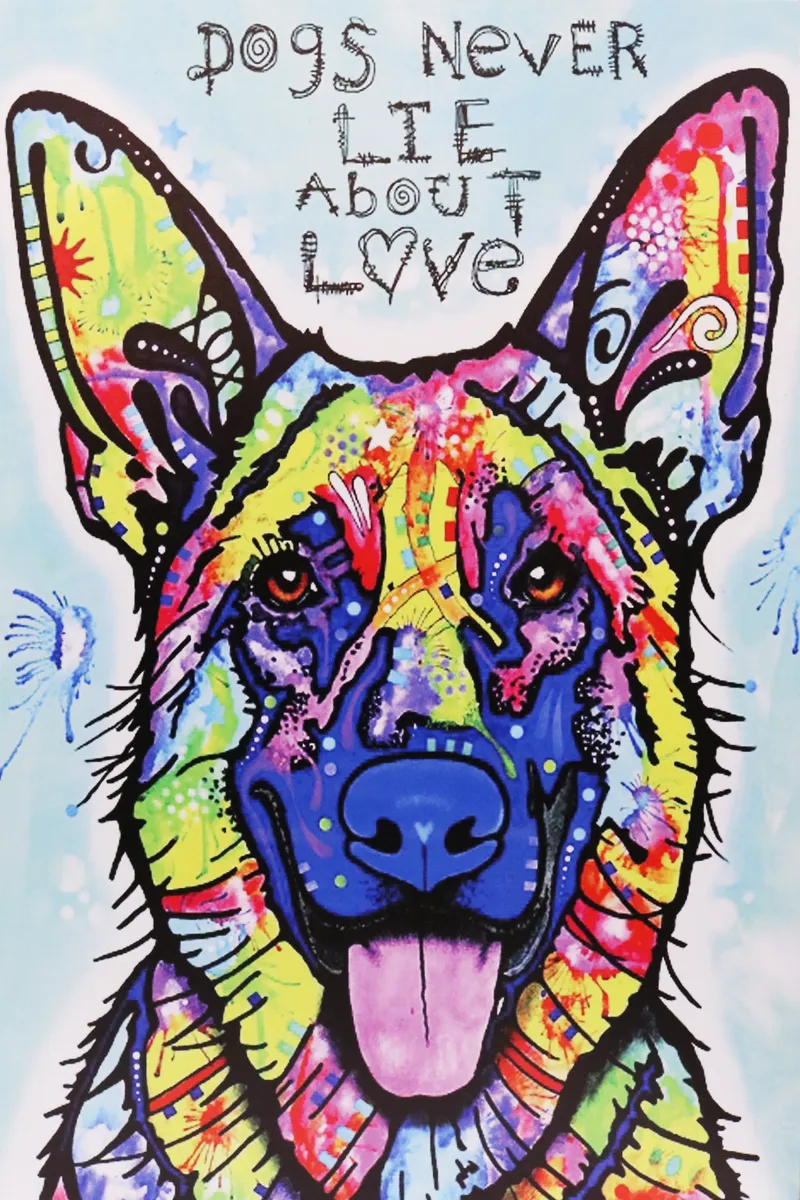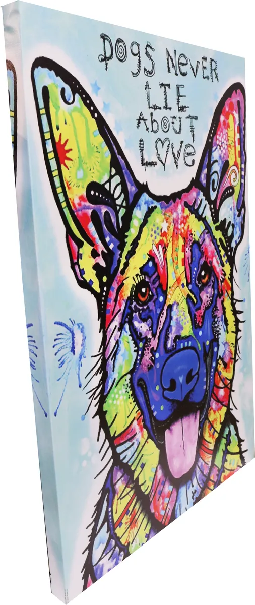 Printad canvastavla på högkvalitativ canvasduk med tryck av en schäferhund med texten ”Dogs never lie about love” Popart, modern konst. Tavlan är uppspänd på 38mm kilram, där duken går över kilramen så den inte syns, redo för upphängning. Krokar medföljer.