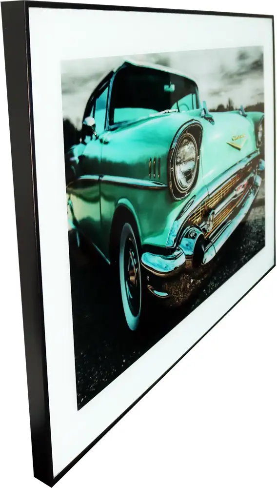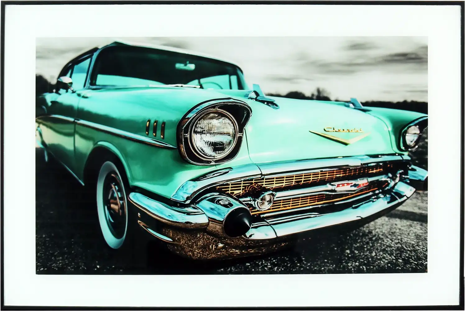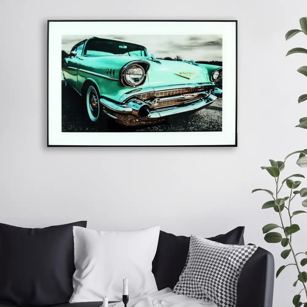 Högkvalitativt tryck på glas för en mer unik och lyxig känsla. Färgstark tavla med motiv av en gammal fin turkos Chevrolet. Perfekt till den som gillar gamla bilar, oldies, cheva, raggarbilar, snygga tavlor och inredning till hemmet.