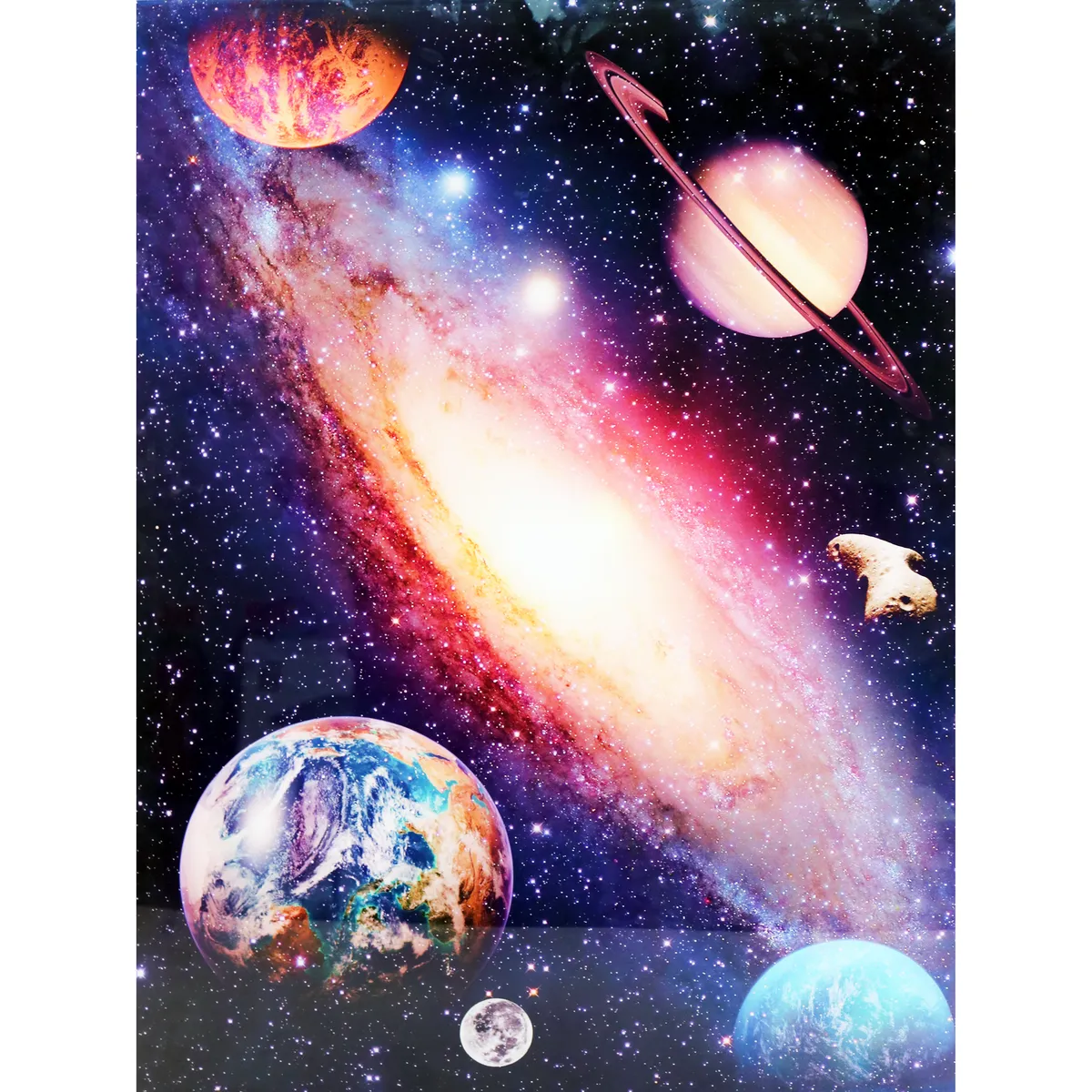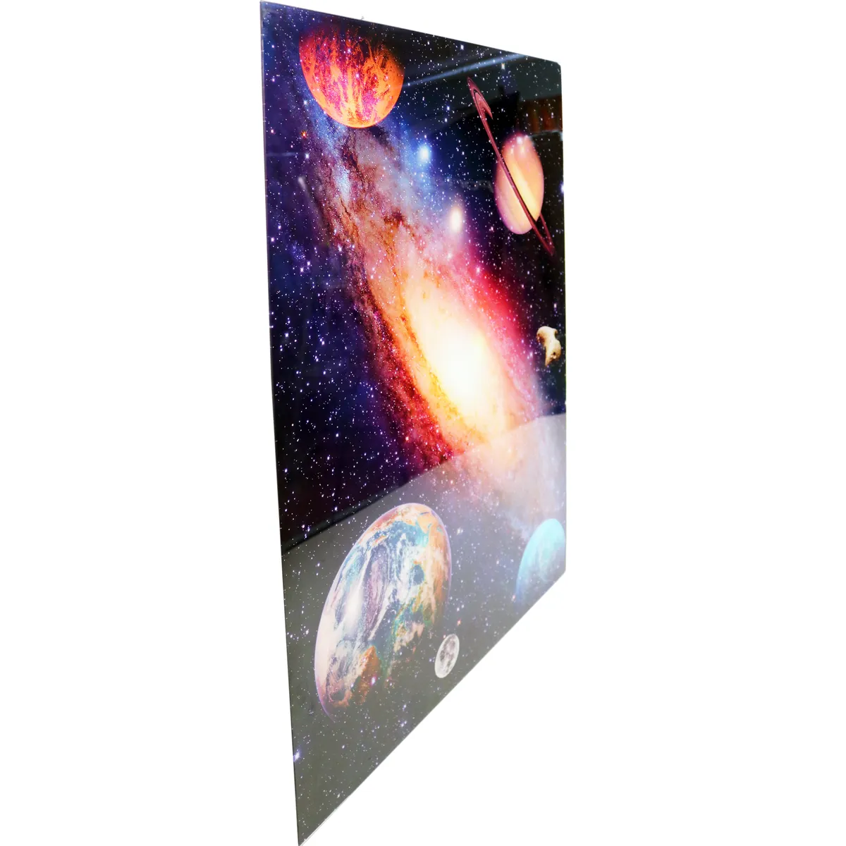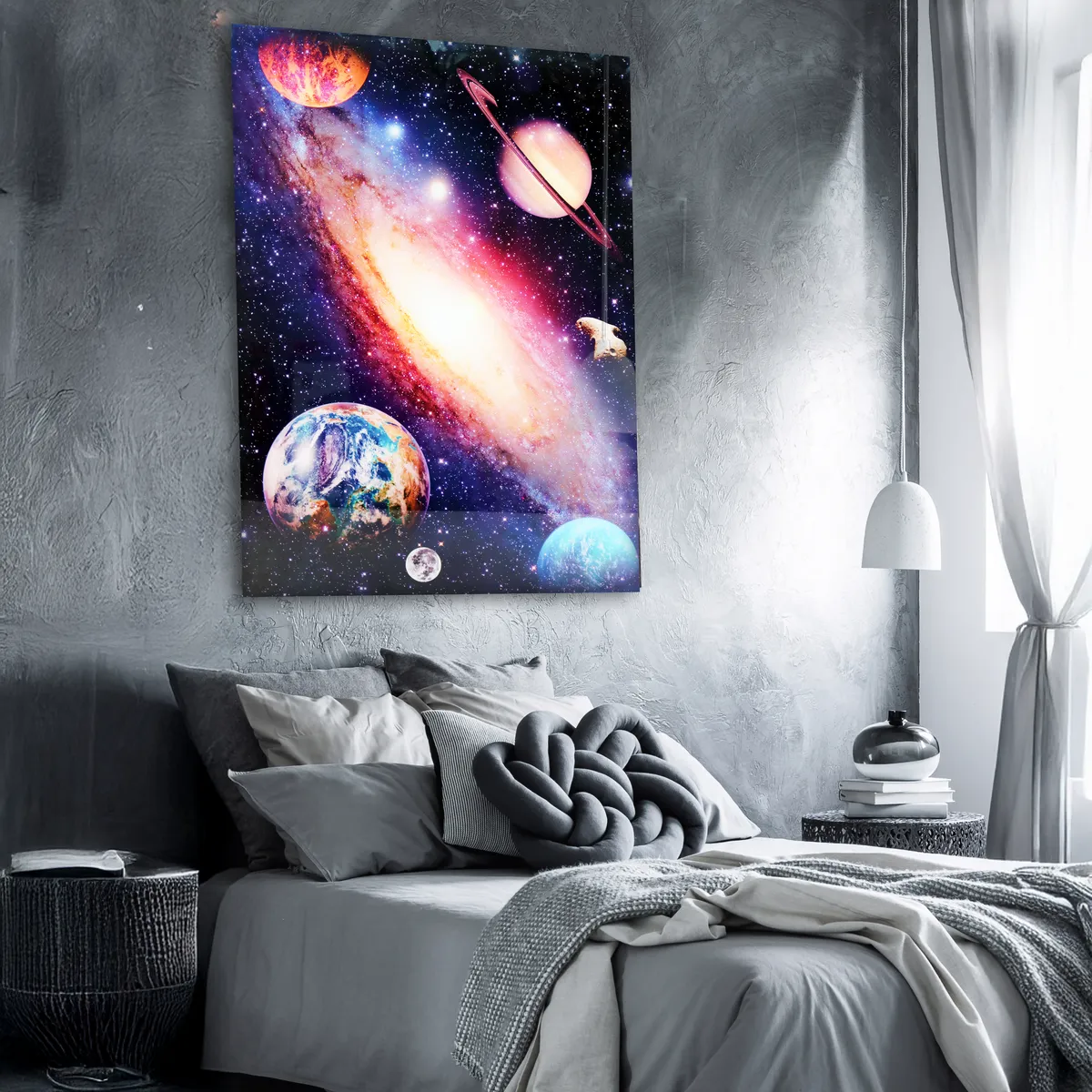 Högkvalitativt tryck på härdat glas för en mer unik och lyxig känsla. Färgstark tavla med motiv av rymdens galaxer och planeter. Perfekt till den som vill ha en färgklick i hemmet och som gillar rymden, planeter, stjärnor, universum, en känsla av lugn och stillhet men ändå något stort och häftigt, göra kollage, snygga tavlor och inredning till hemmet.