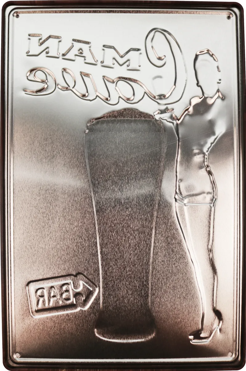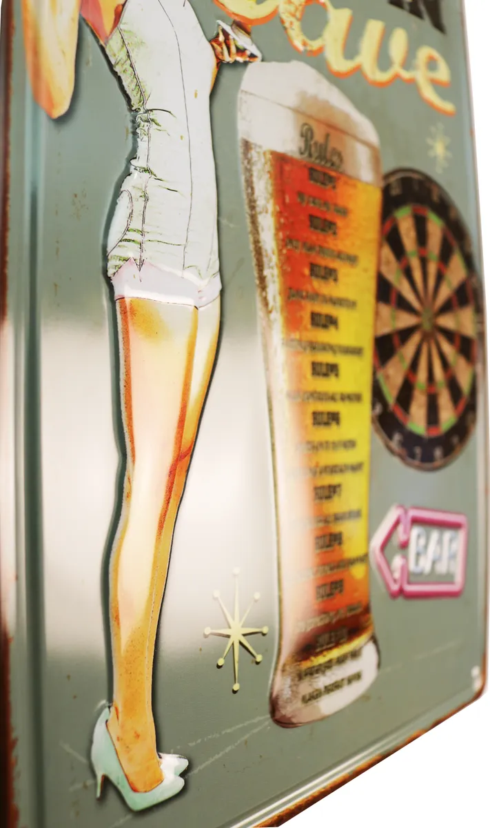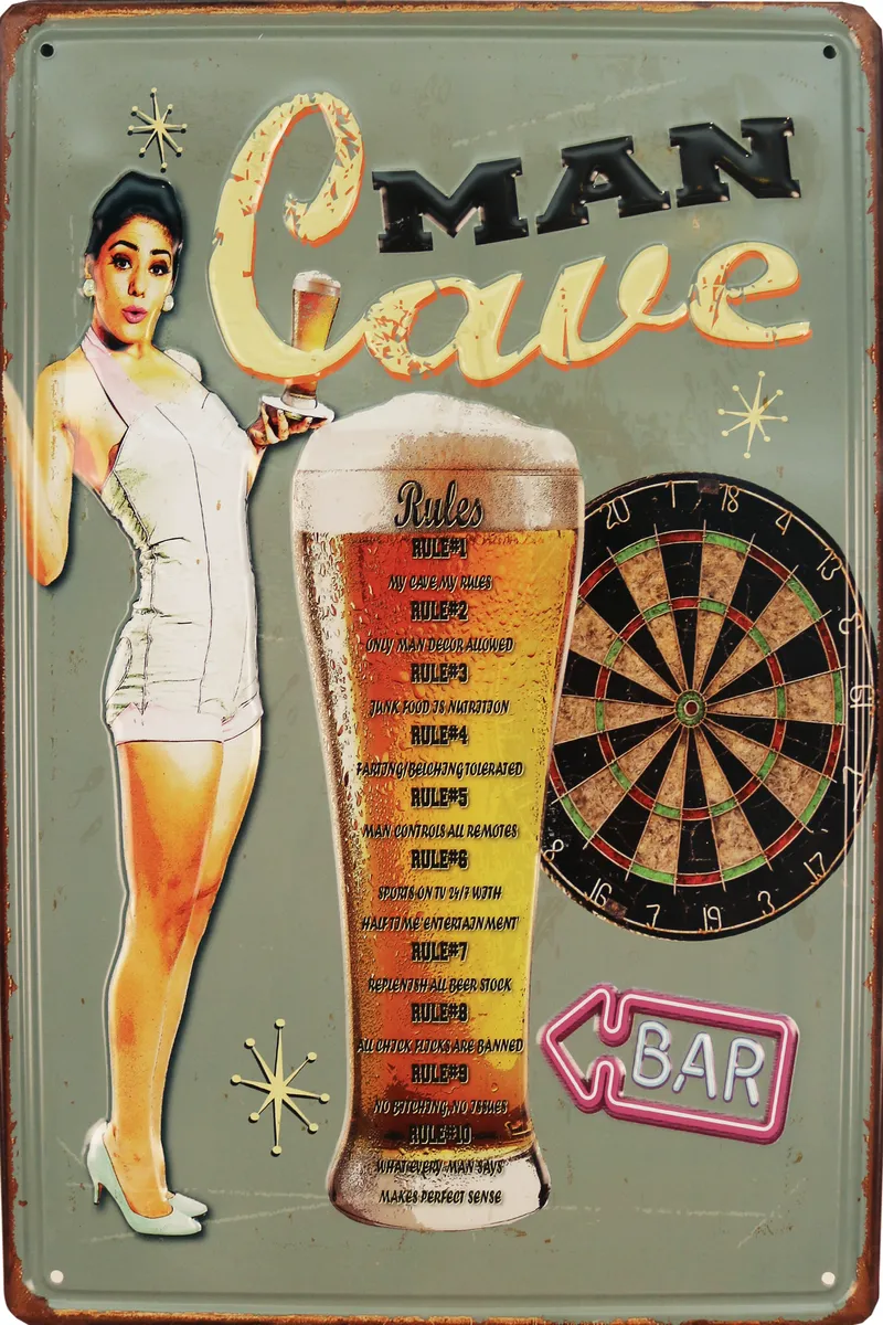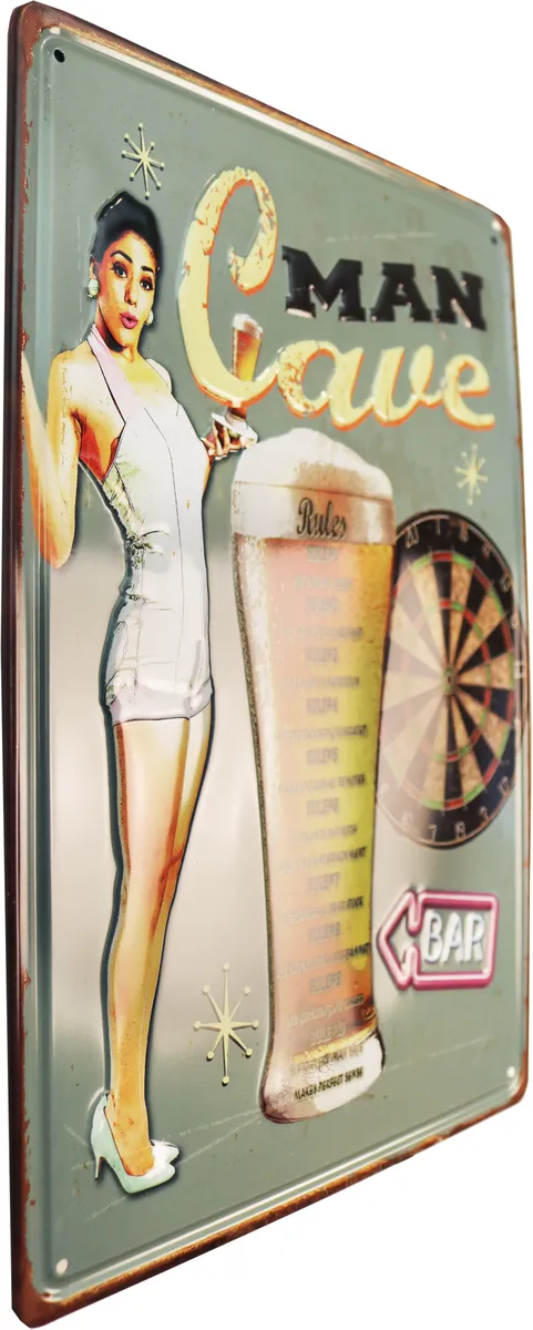 Metalltavla 3D med texten ”Man Cave” och med en snygg pin up tjej bredvid ett stort ölglas och en piltavla. Perfekt till den som gillar att ha kul med sina grabbar, barhäng, öl, inredning till garaget och baren, eller till den som gillar gamla retro reklamskyltar.