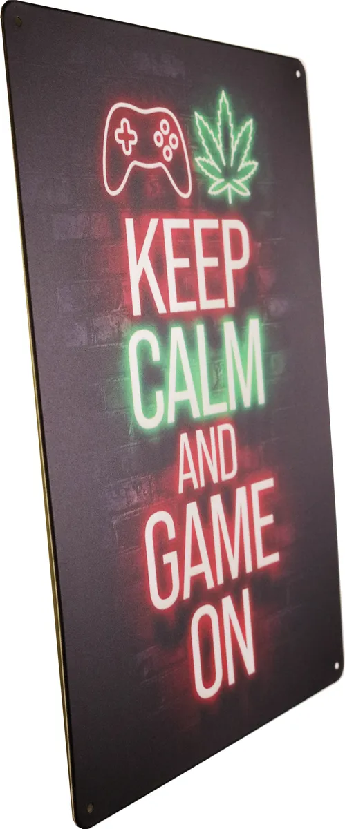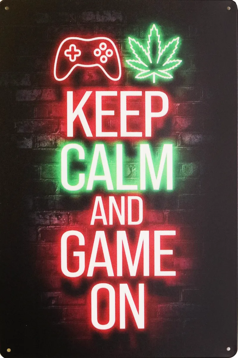 Som metalltavla blir detta en väggdekoration med karaktär och färg som direkt drar blickarna till sig. En plåttavla som passar i spelrummet, mancaven eller vardagsrummet där kreativitet och fritid får mötas. Ljuseffekten i designen ger känslan av äkta neonskylt, vilket skapar en unik atmosfär oavsett var den placeras. Texten är lika tydlig som budskapet själv: håll lugnet, njut av stunden och låt spelet börja.
