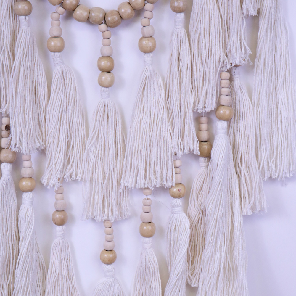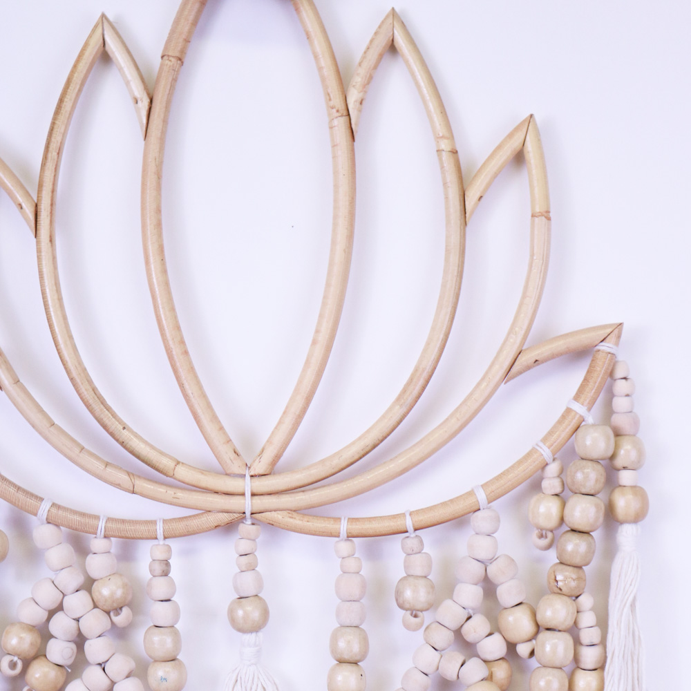 Fin handgjord drömfångare. Vacker trä lotus på toppen med pärlor och tassels som hänger ner under. Gjord av naturmaterial med pärlor och tyg. Varje drömfångare är handgjord och unik, kan variera lite i storlek.