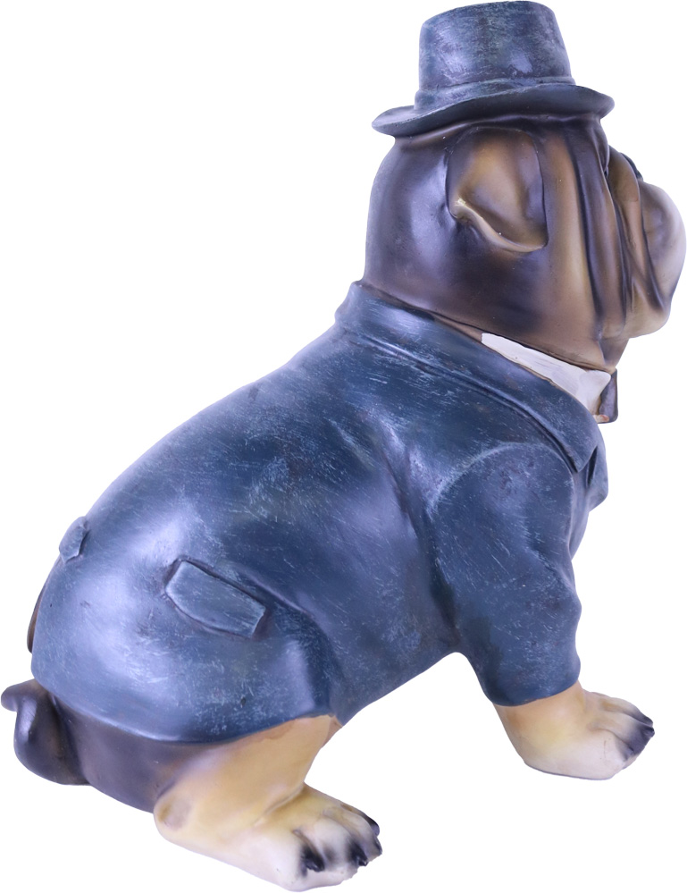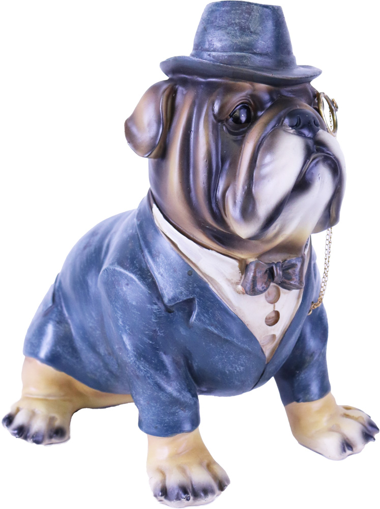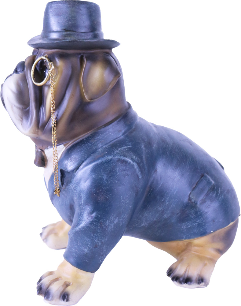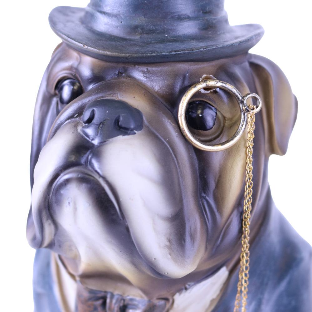 Stilig hund staty med frack, fluga, hatt och Monokel med kedja. Perfekt till den som gillar bulldog, design av klass och annorlunda inredning, unika prydnader, fina prydnadssaker, cool inredning. Denna ståtliga figur i hemmet kommer dra blickarna åt sig.